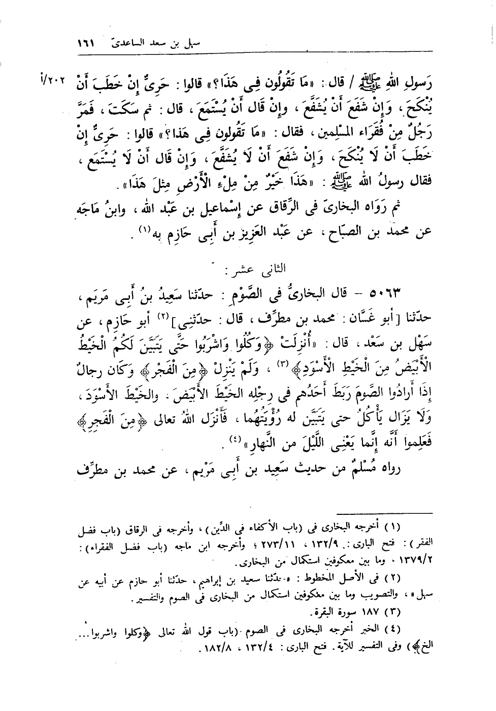 (¬1) في الأصل المخطوط: «حدثنا سعيد بن إبراهيم، حدثنا أبو حازم عن أبيه عن سهل» ، والتصويب وما بين معكوفين استكمال من البخارى في الصوم والتفسير.