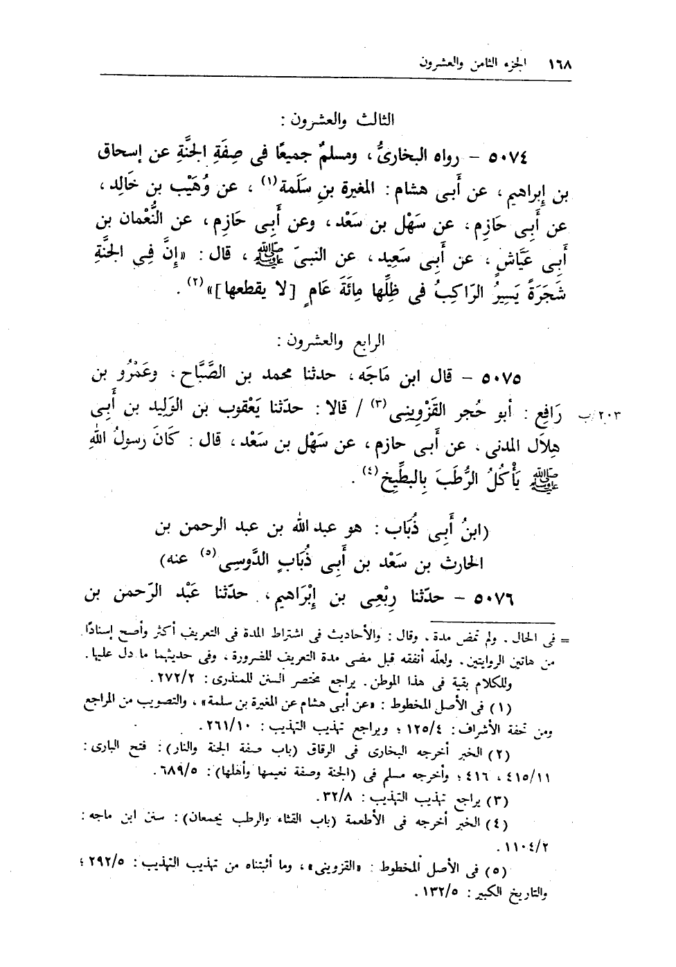 5074 - رواه البخارى، ومسلم جميعًا في صفة الجنة عن إسحاق بن إبراهيم، عن أبى هشام: المغيرة بن سلمة (¬1) ، عن وهيب بن خالد، عن ابى حازم، عن سهل بن سعد، وعن أبى حازم، عن النعمان بن أبى عياش، عن أبى سعيد، عن النبى - صلى الله عليه وسلم -، قال: «إنَّ فِى الجنَّةِ شَجَرَةً يَسِيرُ الرَّاكِبُ في ظِلِّهَا مائَةَ عَامٍ [لا يقطعها] (¬2) .