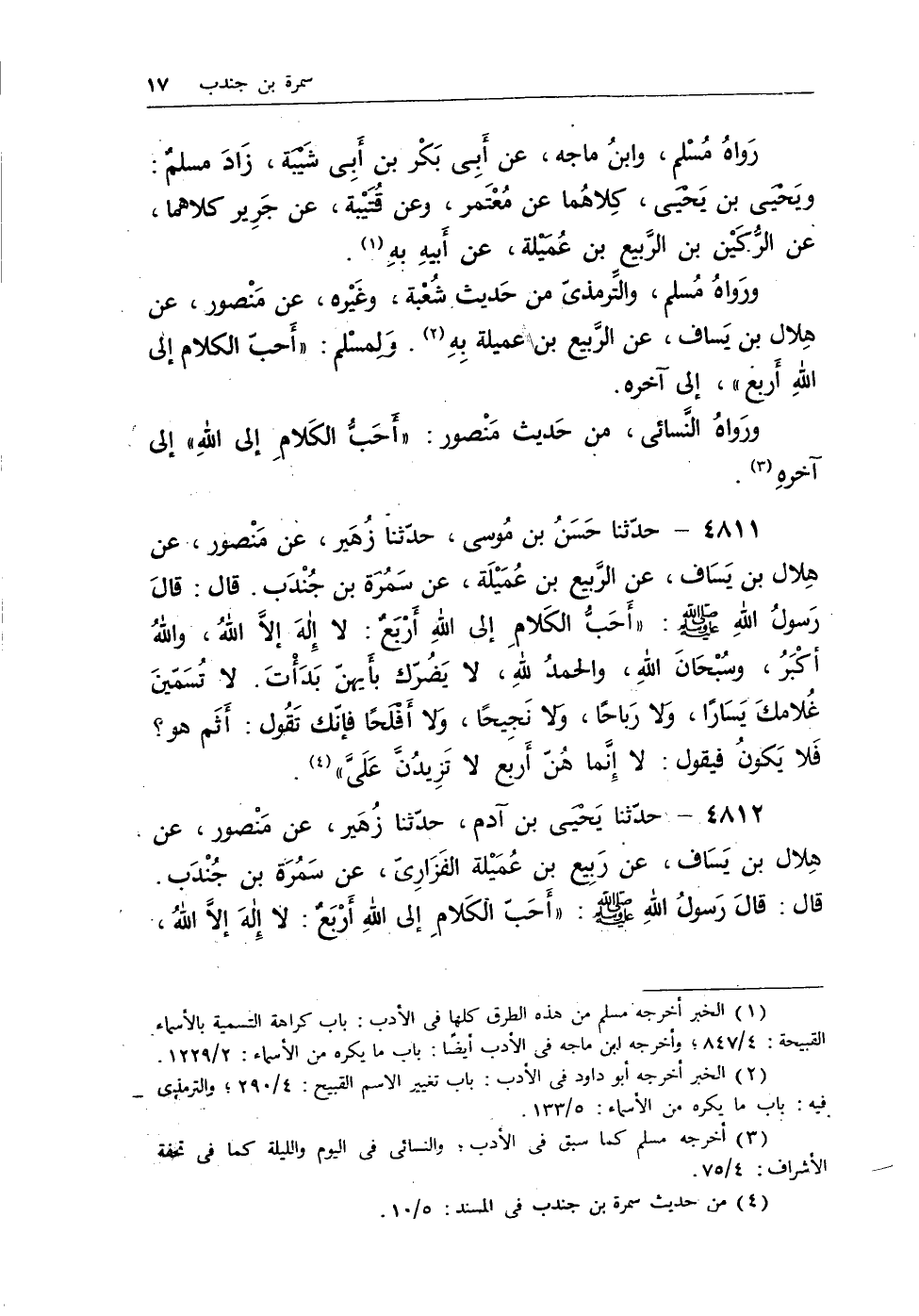 4811- حدّثنا حَسَنُ بن مُوسى، حدّثنا زُهَير، عن مَنْصور، عن هِلال بن يَسَاف، عن الرَّبيع بن عُمَيْلَة، عن سَمُرَة بن جُنْدَب. قال: قالَ رَسولُ اللهِ - صلى الله عليه وسلم -: "أَحَبُّ الكَلامِ إلى اللهِ أَرْبَعٌ: لا إِلهَ إلاَّ اللهُ، واللهُ أكْبَرُ، وسُبْحَانَ اللهِ، والحمدُ للهِ، لا يَضُرّك بأَيهنّ بَدَأْتَ. لا تُسَمّينَ غُلامكَ يَسَارًا، وَلا رَباحًا، وَلا نَجِيحًا، وَلا أَفْلَحًا فإنّك تَقُول: أَثَم هو؟ فَلا يَكونُ فيقول: لا إِنَّما هُنّ أَربع لا تَزِيدُنَّ عَلَيَّ" (¬4) .