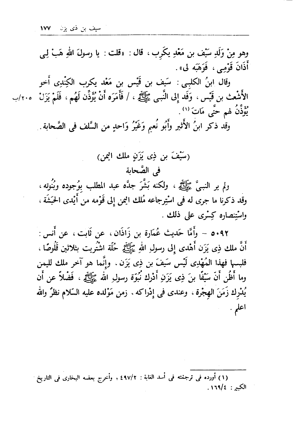 5092 - وأمَّا حديث عمارة بن زاذان، عن ثابت، عن أنس: أن ملك ذى يزن أهدى إ لى رسول الله - صلى الله عليه وسلم - حلة اشتريت بثلاثين قلوصًا، فلبسها فهذا المهدى ليس سيف بن ذى يزن، وإنما هو آخر ملك لليمن وما أظن أن سيفًا بن ذى يزن أدرك نبوة رسول الله - صلى الله عليه وسلم -، فضلا عن أن يدرك زمن الهجرة، وعندى في إدراكه، زمن مولده عليه السلام نظر والله أعلم.