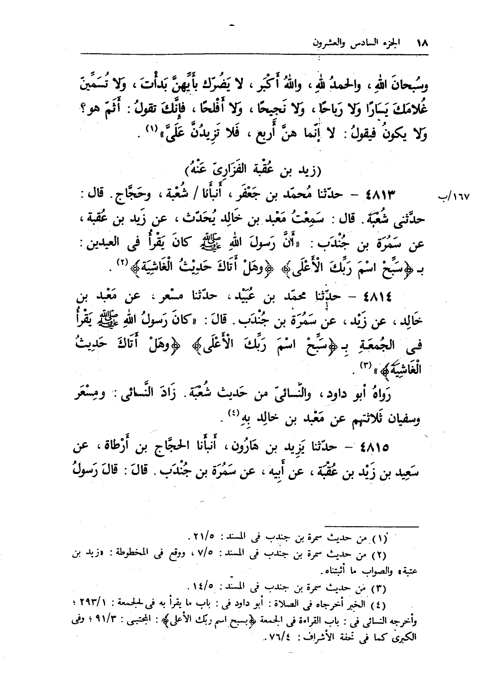 4813- حدّثنا مُحمّد بن جَعْفَر، أَنبأَنا / شُعْبة، وحَجَّاج. قال: حدَّثني شُعْبَة. قال: سَمِعْتُ مَعْبد بن خَالِد يُحَدّث، عن زَيد بن عُقبة، عن سَمُرَة بن جُنْدَب: "أَنَّ رَسولَ اللهِ - صلى الله عليه وسلم - كانَ يَقْرأُ في العيدين: بـ (سَبِّحْ اسْمَ رَبِّكَ الْأَعْلَى) (وهَلْ أَتَاكَ حَدِيْثُ الْغَاشِيَة) (¬2) .