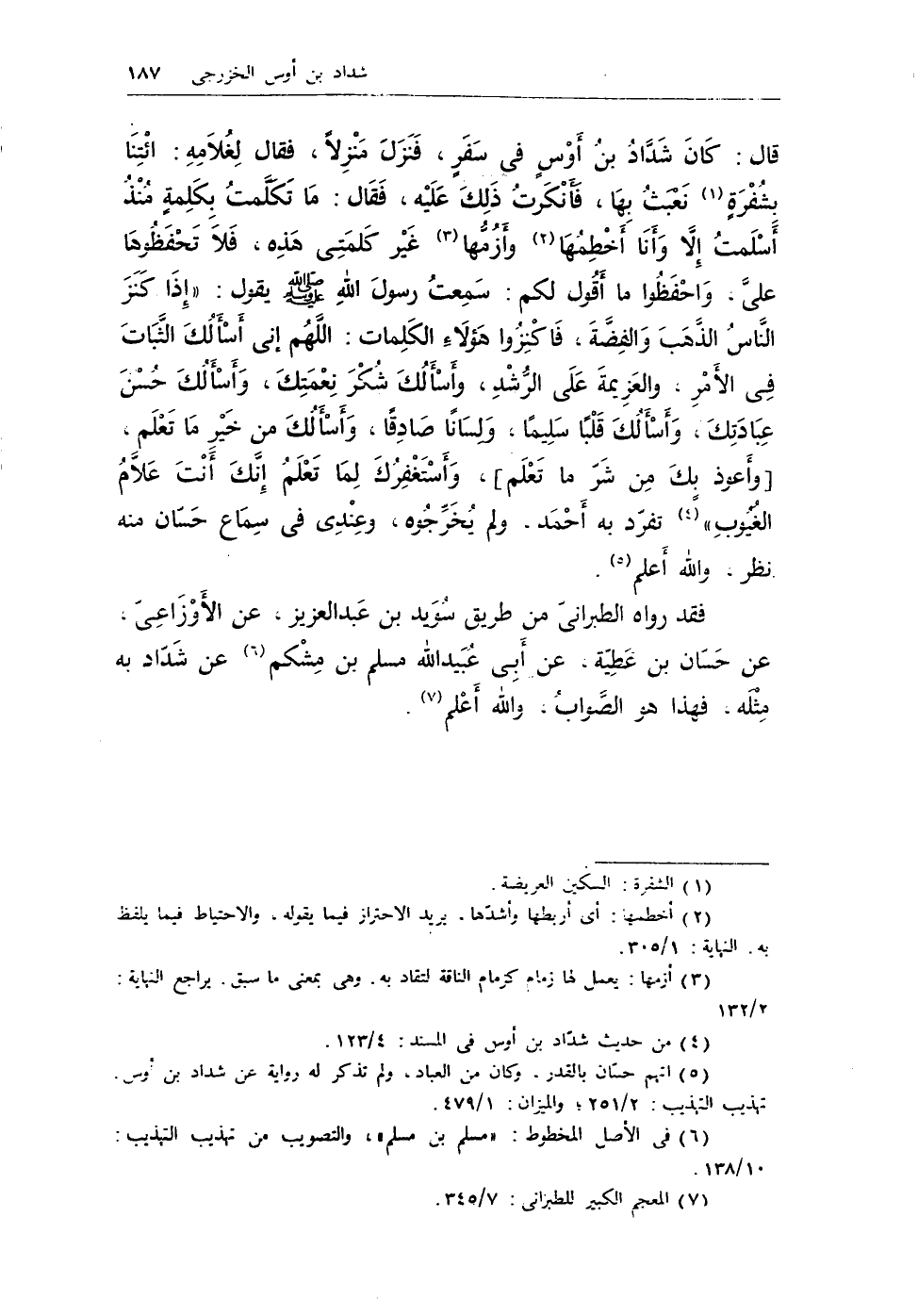 قال: كان شداد بن أوس في سفر، فنزل منزلا، فقال لغلامه: ائتنا بشفرة (¬1) نعبث بها، فأنكرت ذلك عليه، فقال: ما تكلمت بكلمة منذ أسلمت إلا وأنا أخطِمُها (¬2) وأزمها (¬3) غير كلمتى هذه، فلا تحفظوها على، واحفظوا ما أقول لكم: سمعت رسول الله - صلى الله عليه وسلم - يقول: «إذَا كَنَزَ النَّاسُ الذَّهَبَ والفِضَّةَ، فاكْنِزُوا هَؤلاَء الكَلِمات: اللهم إنى أسألُكَ الثَّبَاتَ في الأمرِ، والعزِيمةَ على الرُّشْدِ، وأسألُكَ شُكْرَ نعْمَتِكَ، وأسألكَ حُسنَ عبادَتِكَ، وأسألُكَ قلبًا سليمًا، ولسانًا صادقًا، وأسألُكَ من خيْرِ ما تَعْلَم، [وأعوذُ بِكَ منْ شرِّ ما تعْلَم] ، وأستغْفِرُكَ لما تَعْلَمُ إنَّكَ أنْتَ علاَّمُ الغُيوبِ» (¬4) تفرد به أحمد، ولم يخرجوه، وعندى في سماع حسان منه انظر، والله أعلم (¬5) .