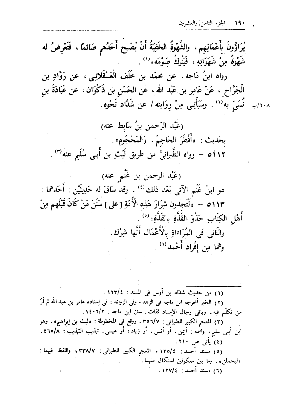 رواه ابن ماجه. عن محمد بن خلف العسقلانى، عن رواد بن الجراح، عن عامر بن عبد الله، عن الحسن بن ذكوان، عن عبادة بن نسى به (¬2) ، وسيأتى من روايته / عن شداد نحوه.