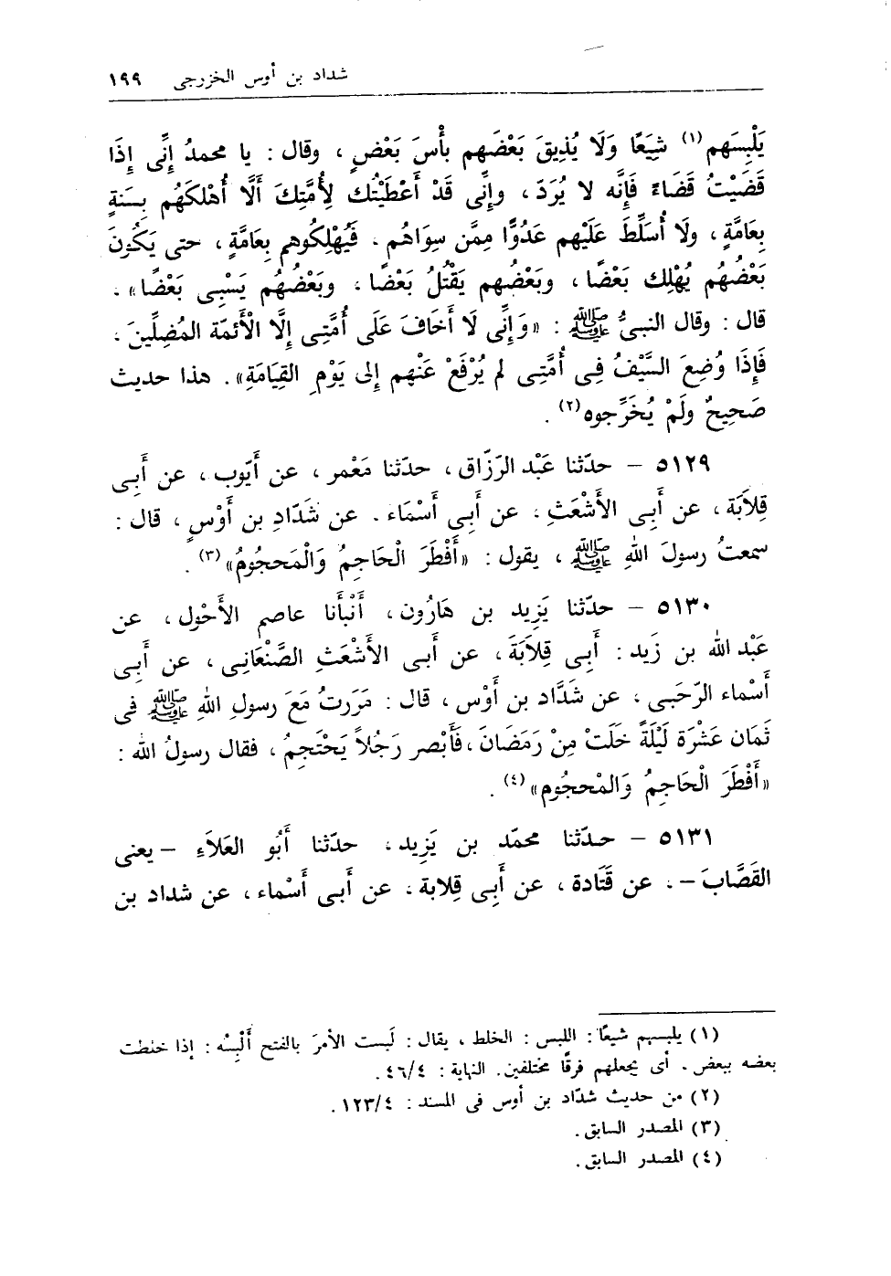 5129 - حدثنا عبد الرازق، حدثنا معمر، عن أيوب، عن أبى قلابة، عن ابى الأشعث، عن أبى أسماء، عن شداد بن أوس، قال: سمعت رسول الله - صلى الله عليه وسلم -، يقول: «أفْطِر الحَاجِم والمَحْجُوم» (¬1) .