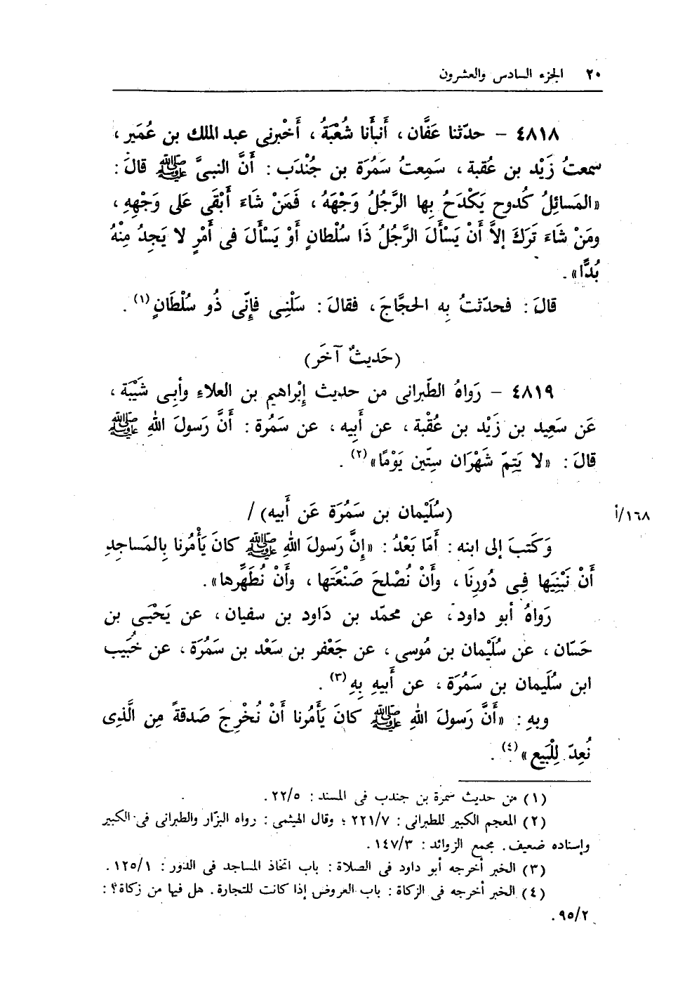 4818- حدّثنا عَفَّان، أَنبأَنا شُعْبَةُ، أَخْبرني عبد الملك بن عُمَير، سمعتُ زَيْد بن عُقبة، سَمِعتُ سَمُرَة بن جُنْدَب: أَنَّ النبيَّ - صلى الله عليه وسلم - قالَ: "المَسائِلُ كُدوح يَكْدَحُ بِها الرَّجُلُ وَجْهَهُ، فَمَنْ شَاءَ أَبْقَى عَلى وَجْهِهِ، ومَنْ شَاءَ تَرَكَ إلاَّ أَنْ يَسْأَلَ الرَّجُلُ ذَا سُلْطانٍ أَوْ يَسْألَ في أمْرٍ لا يَجِدُ مِنْهُ بُدًّا".