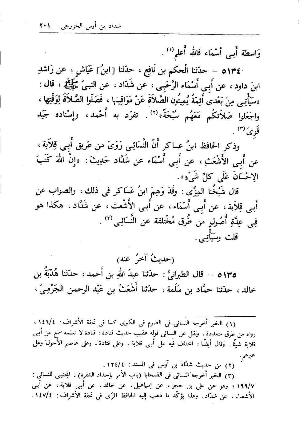 وذكر الحافظ ابن عساكر أن النسائى روى من طريق أبى قلابة، عن أبى الأشعث، عن أبى أسماء عن شداد حديث: «إِنَّ اللهَ كَتَبَ الإِحْسَانَ عَلَى كلِّ شَىْءٍ» .