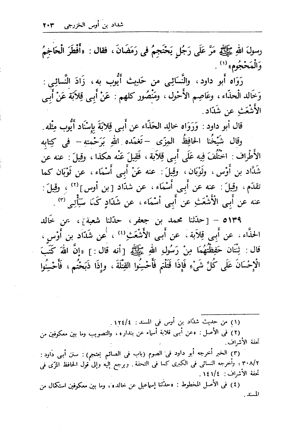 رواه أبو داود، والنسائى من حديث أيوب به، زاد النسائى: وخالد الحذاء، وعاصم الأحول، ومنصور كلهم: عن أبى قلابة عن أبى الأشعث عن شداد.