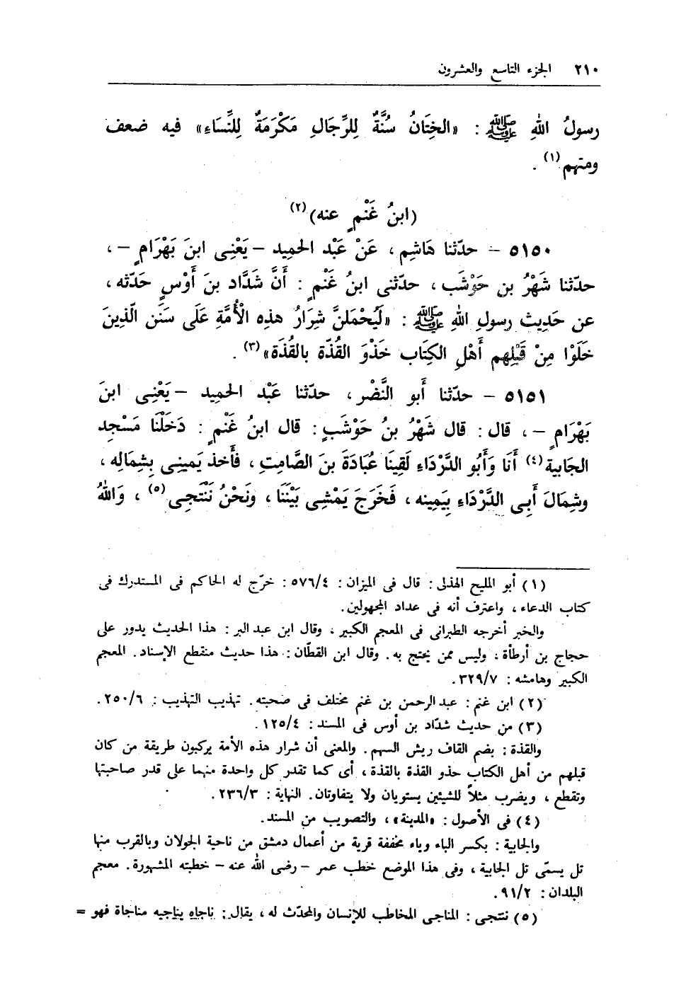 5151 - حدثنا أبو النضر، حدثنا عبد الحميد- يعنى ابن بهرام- قال: قال شهر بن حوشب: قال ابن غنم: دخلنا مسجد الجابية (¬2) أنا وأبو الدرداء لقينا عبادة ابن الصامت، فأخذ يمينى بشماله، وشمال أبى الدرداء بيمينه، فخرج يمشى بيننا ونحن ننتجى (¬3) ، والله