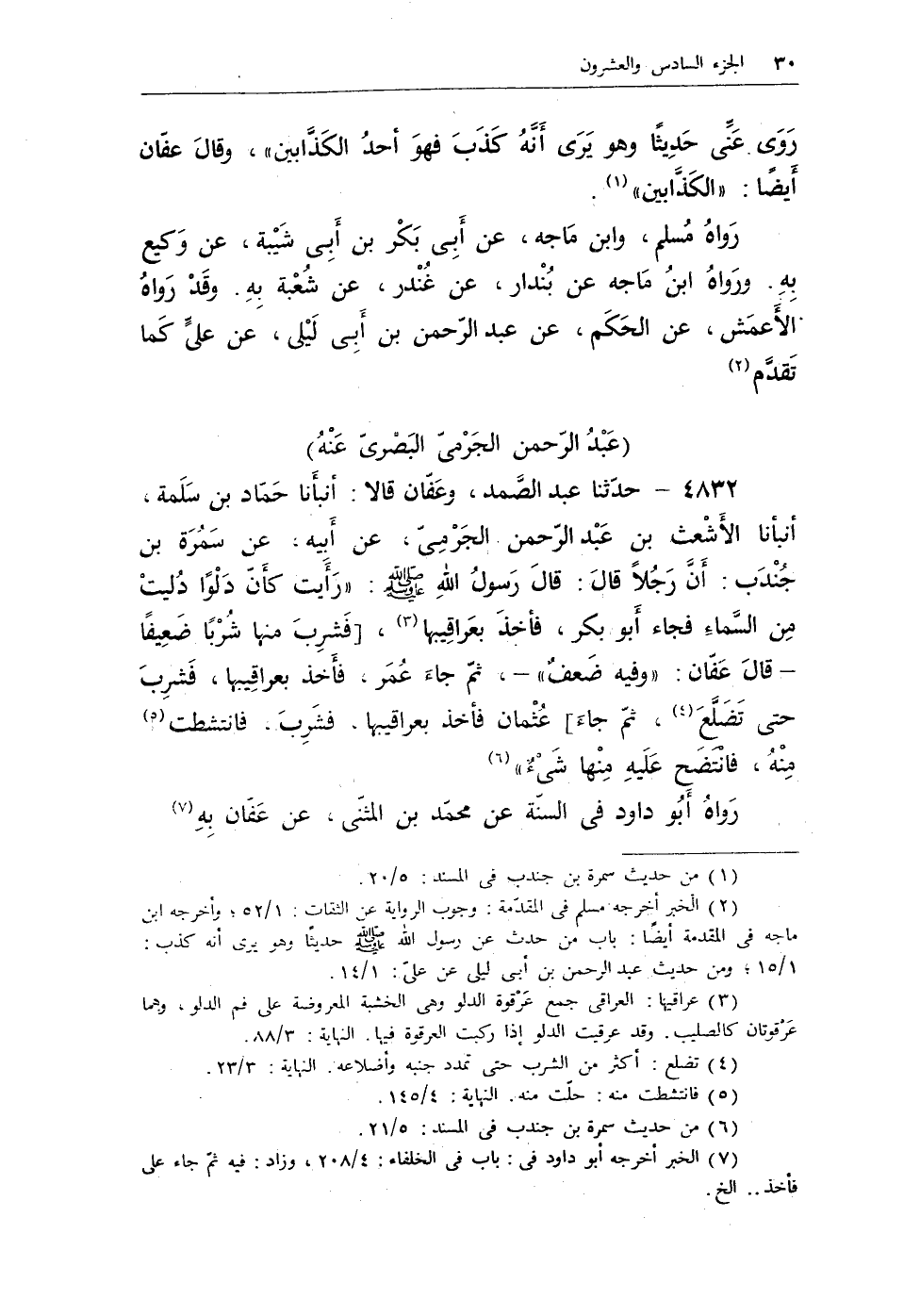4832- حدّثنا عبد الصَّمد، وعَفّان قالا: أنبأَنا حَمّاد بن سَلَمة، أنبأنا الأَشْعث. بن عَبْد الرّحمن. الجَرْمِيّ عن أَبيه، عن سَمُرَة بن جُنْدَب: أَنَّ رَجُلاً قالَ: قالَ رَسولُ اللهِ - صلى الله عليه وسلم -: "رَأًيت كأَنّ دَلْوًا دُليتْ مِن السَّماءِ فجاء أَبو بكر، فأخذَ بعَراقِيبها (¬3) ، [فَشرِبَ منها شُرْبًا ضَعِيفًا -قالَ عَفّان: "وفيه ضَعفٌ"-، ثمّ جاءَ عُمَر، فأَخذ بعراقِيبها، فَشرِبَ حتى تَضَلَّعَ (¬4) ، ثمّ جاءَ] عُثْمان فأخذ بعراقيبها، فشَرِبَ. فانتشطت (¬5) مِنْهُ، فانْتَضَح عَلَيهِ مِنْها شَيْءٌ (¬6)