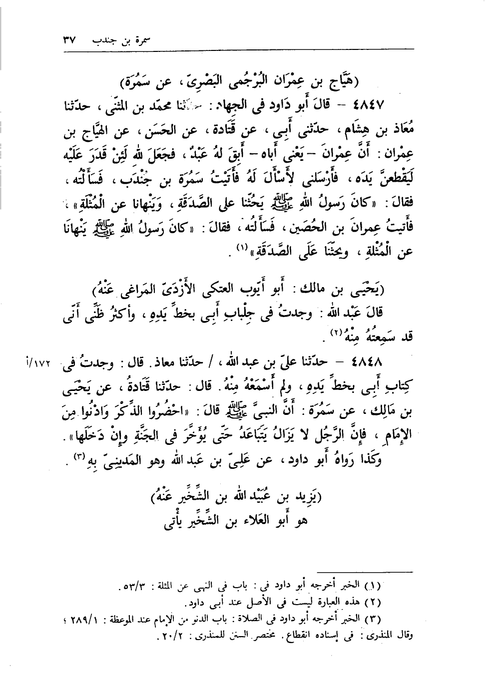 4847- قالَ أَبو دَاود في الجِهاد: حدّثنا محمّد بن المثنّى، حدّثنا مُعَاذ بن هِشَام، حدّثني أَبِي، عن قَتَادة، عن الحَسَن، عن الهيَّاج بن عِمْران: أَنَّ عِمْرانَ -يَعْني أَباه- أَبِقَ لهُ عَبْدٌ، فجَعَلَ للهِ لَئِنْ قَدَرَ عَلَيْه لَيَقْطعنَّ يَدَه، فأَرْسَلي لأَسْأَلَ لَهُ فأَتَيْتُ سَمُرَة بن جُنْدَب، فَسَأَلْتُه، فقالَ: "كانَ رَسولُ اللهِ - صلى الله عليه وسلم - يَحُثّنا على الصَّدَقَةِ، وَيَنْهانا عن الْمُثْلَةِ"، فأَتيتُ عِمرانَ بن الحُصَين، فَسَأَلتُه، فقالَ: "كانَ رَسولُ اللهِ - صلى الله عليه وسلم - يَنْهانَا عن الْمُثْلةِ، ويحثّنَا عَلَى الصَّدَقَةِ" (¬1) .