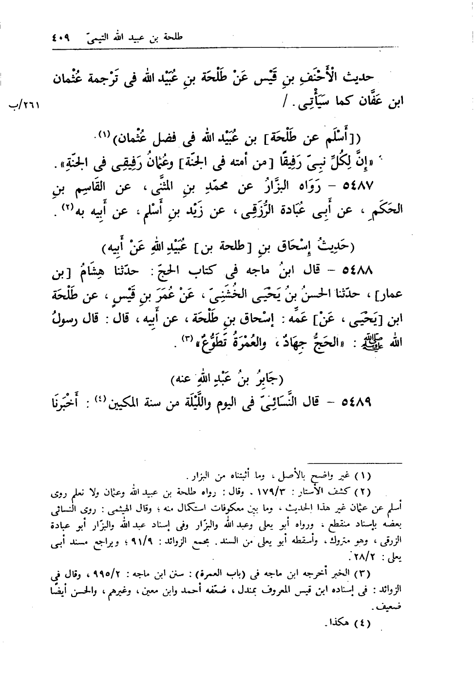 (¬1) كشف الأستار: 3/179، وقال: رواه طلحة بن عبيد الله وعثمان ولا نعلم روى أسلم عن عثمان غير هذا الحديث، وما بين معكوفات استكمال منه؛ وقال الهيثمى: روى النسائى بعضه بإسناد منقطع، ورواه أبو يعلى وعبد الله والبزار وفى إسناد عبد الله والبزار أبو عبادة الزرقى، وهو متروك، وأسقطه أبو يعلى من السند. مجمع الزوائد: 9/91؛ ويراجع مسند أبى يعلى: 2/28.