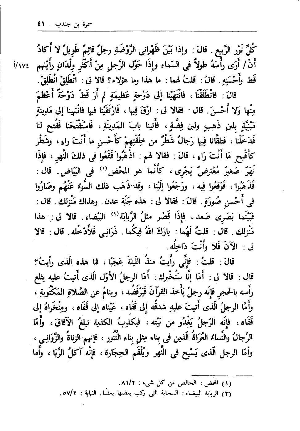 قال: فانطلقنا، فانتهينا إلى دوحة عظيمة لم أر قط دوحة أعظم منها ولا أحسن. قال: فقالا لى. ارق فيها، فارتقينا فيها فانتهينا إلى مدينة مبنية بلبن ذهب ولبن فضة، فأتينا باب المدينة، فاستفتحنا ففتح لنا فدخلنا فتلقانا فيها رجال شطر من خلقتهم كأحسن ما أنت راء، وشطر كأقبح ما أنت راء، قال: فقالا لهم: اذهبوا فقعوا في ذلك النهر، فإذا نهر صغير معترض يجرى، كأنما هو المحض (¬1) في البياض. قال: فذهبوا، فوقعوا فيه، ورجعوا إلينا، وقد ذهب ذلك السوء عنهم وصاروا في أحسن صورة. قال: فقالا لى: هذه جنة عدن. وهذاك منزلك. قال: فبينما بصرى صعد، فإذا قصر مثل الربابة (¬2) البيضاء. قالا لى: هذا منزلك. قال: قلت لهما: بارك الله فيكما. ذرانى فلأدخله. قال: قالا لى: الآن فلا وأنت داخله.