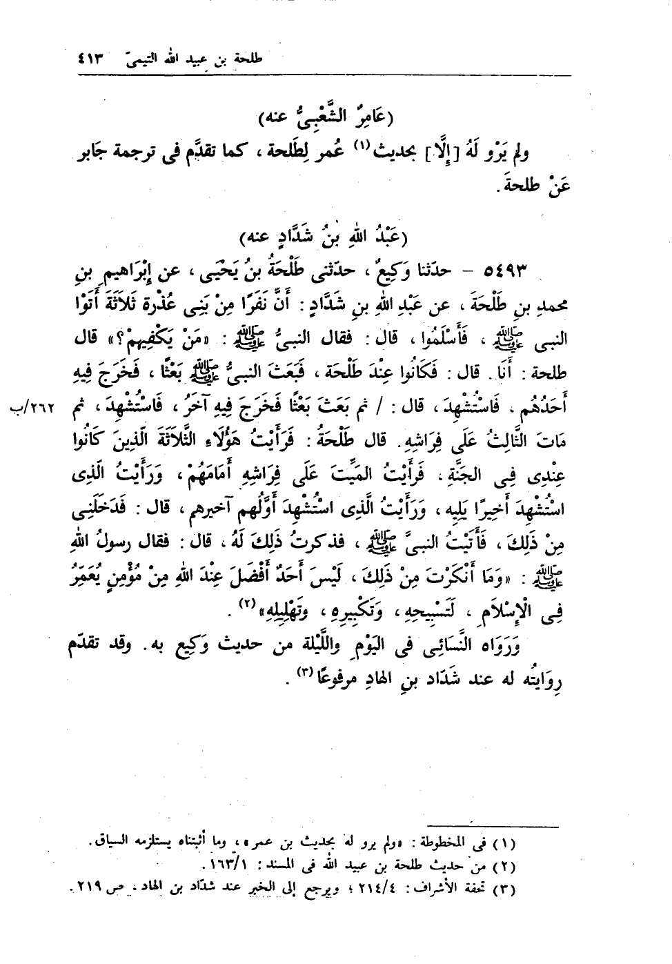 5493 - حدثنا وكيع، حدثنى طلحة بن يحيى، عن إبراهيم بن محمد بن طلحة، عن عبد الله بن شداد: أن نفراً من بنى عذرة ثلاثة أتوا النبى - صلى الله عليه وسلم -، فاسلموا، قال: فقال النبى - صلى الله عليه وسلم -: «مَنْ يَكْفِيهِمْ؟» قال طلحة: أما. قال: فكانوا عند طلحة، فبعث النبى - صلى الله عليه وسلم - بعثًا، فخرج فيه أحدهم، فاستشهد، قال: / ثم بعث بعثًا فخرج فيه آخر، فاستشهد، ثم مات الثالث على فراشه. قال طلحة: فرأيت هؤلاء الثلاثة الذين كانوا عندى فى الجنة، فرأيت الميت على فراشه أمامهم، ورأيت الذى استشهد أخيرًا يليه، ورأيت الذى استشهد أولهم آخيرهم، قال: فدخلنى من ذلك، فأتيت النبى - صلى الله عليه وسلم -، فذكرت ذلك له، قال: فقال رسول الله - صلى الله عليه وسلم -: «وَمَا أَنْكَرْتَ مِنْ ذَلِكَ، لَيْسَ أَحَدٌ أَفْضَلَ عِنْدَ اللهِ مِنْ مُؤْمِنٍ يُعَمِّرُ فِى الإِسْلاَمِ، لَتَسْبِيحِهِ، وَتَكْبِيرِهِ، وَتَهْلِيلِهِ» (¬1) .