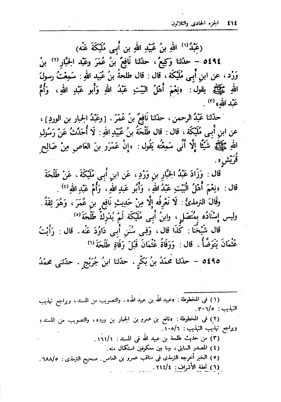 وقال الترمذى: لا نعرفه إلا من حديث نافع بن عمر، وهو ثقة، وليس إسناده بمتصل، وابن أبى مليكة لم يدرك طلحة (¬4) .
