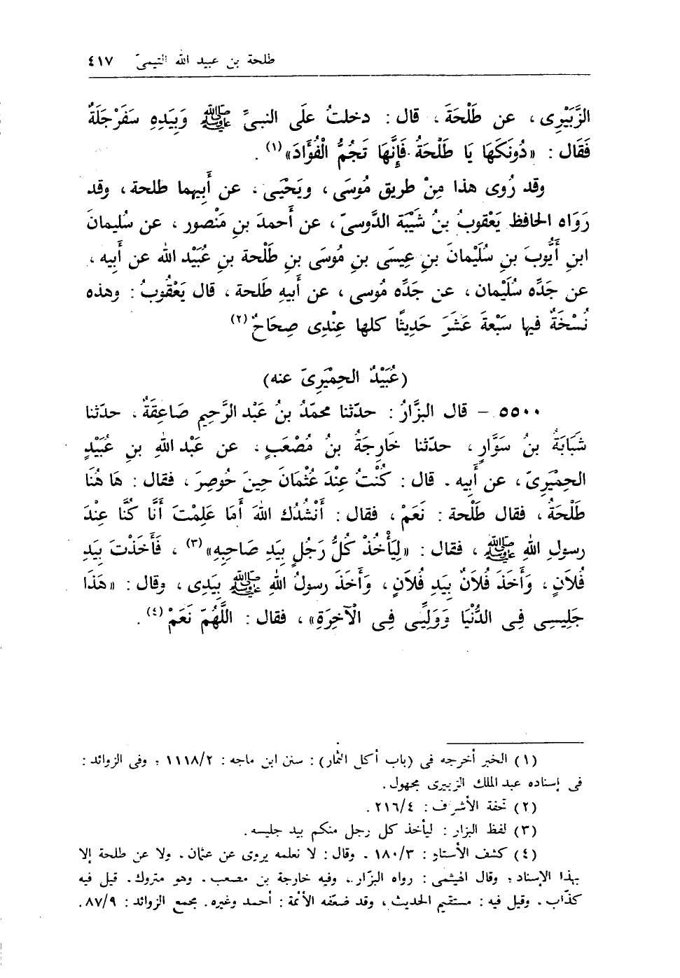 5500 - قال البزار: حدثنا محمد بن عبد الرحيم صاعقة، حدثنا شبابة بن سوار، حدثنا خارجة بن مصعب، عن عبد الله بن عبيد الحميرى، عن أبيه، قال: كنت عند عثمان حين حوصر، فقال: ها هنا طلحة، فقال طلحة: نعم، فقال: أنشدك الله أما علمت أنا كنا عند رسول الله - صلى الله عليه وسلم -، فقال: «لِيَأْخُذْ كُلُّ رَجُلٍ بِيَدِ صَاحِبِهِ» (¬1) ، فأخذت بيد فلانً، وأخذ فلانٌ بيد فلانٍ، وأخذ رسول الله - صلى الله عليه وسلم - بيدى، وقال: «هَذَا جَلِيسِى فِى الدُّنْيَا وَوَلِيِّى فِى الآخِرَةِ» ، فقال: اللهم نعم (¬2) .