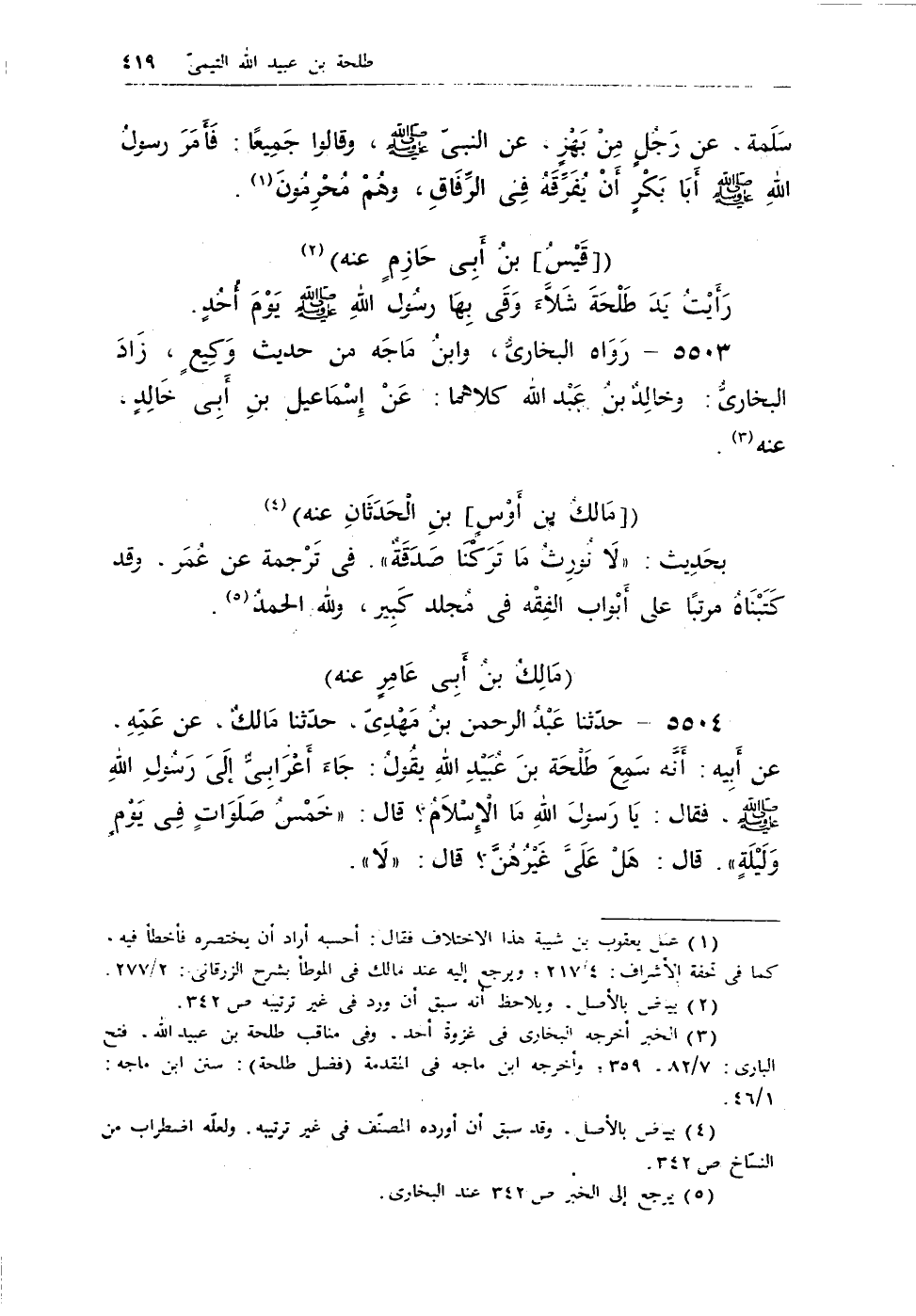 5504 - حدثنا عبد الرحمن بن مهدى، حدثنا مالك، عن عمه، عن أبيه، أنه سمع طلحة بن عبيد الله يقول: جاء أعرابى إلى رسول الله - صلى الله عليه وسلم -، وقال: يا رسول الله ما الإسلام؟ قال: «خَمْسَ صَلَوَاتٍ فِى يَوْمٍ وَلَيْلَةٍ» . قال: هل علىَّ غيرهن؟ قال: «لاَ» .