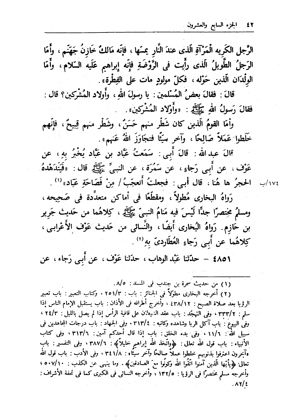 رواه البخارى مطولاً، ومقطعًا في أماكن متعددة في صحيحه، ومسلم مختصرا جدًا ليس فيه منام النبى - صلى الله عليه وسلم -، كلاهما من حديث جرير بن حازم. رواه البخارى أيضًا، والنسائى من حديث عوف الأعرابى، كلاهما عن أبى رجاء العطاردى به (¬2) .