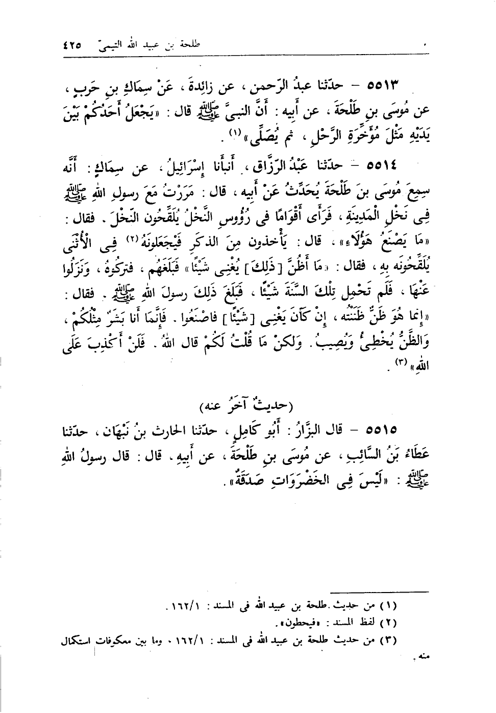 (¬3) من حديث طلحة بن عبيد الله فىالمسند: 1/162، وما بين معكوفات استكمال منه.