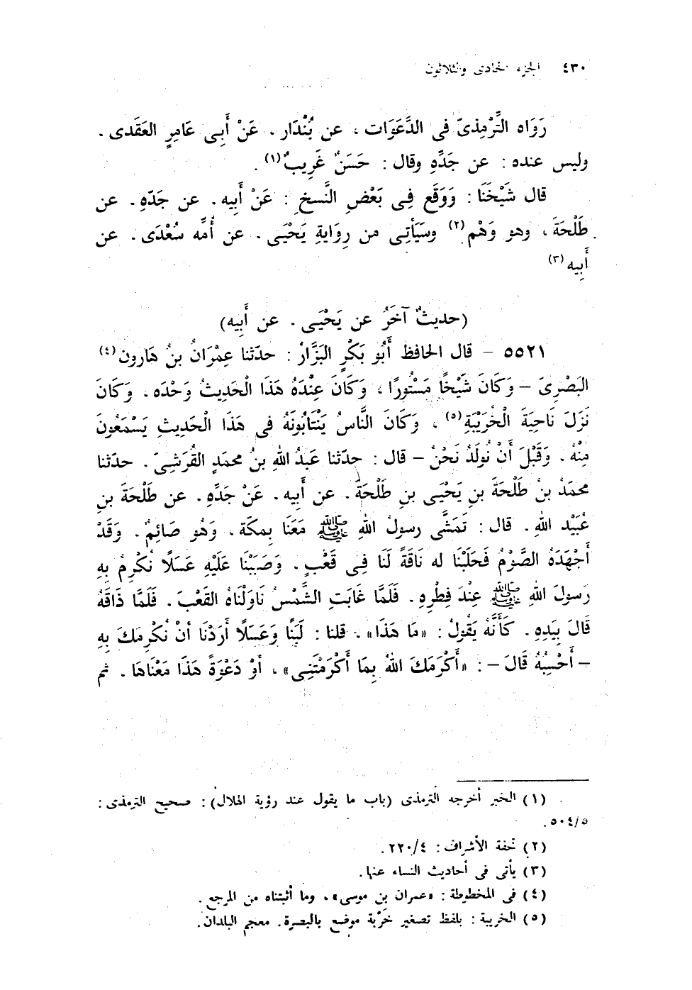 قال شيخنا: ووقع فى بعض النسخ: عن أبيه، عن جده، عن طلحة، وهو وهم (¬2) وسيأتى من رواية يحيى، عن أمه سعدى، عن أبيه (¬3) .