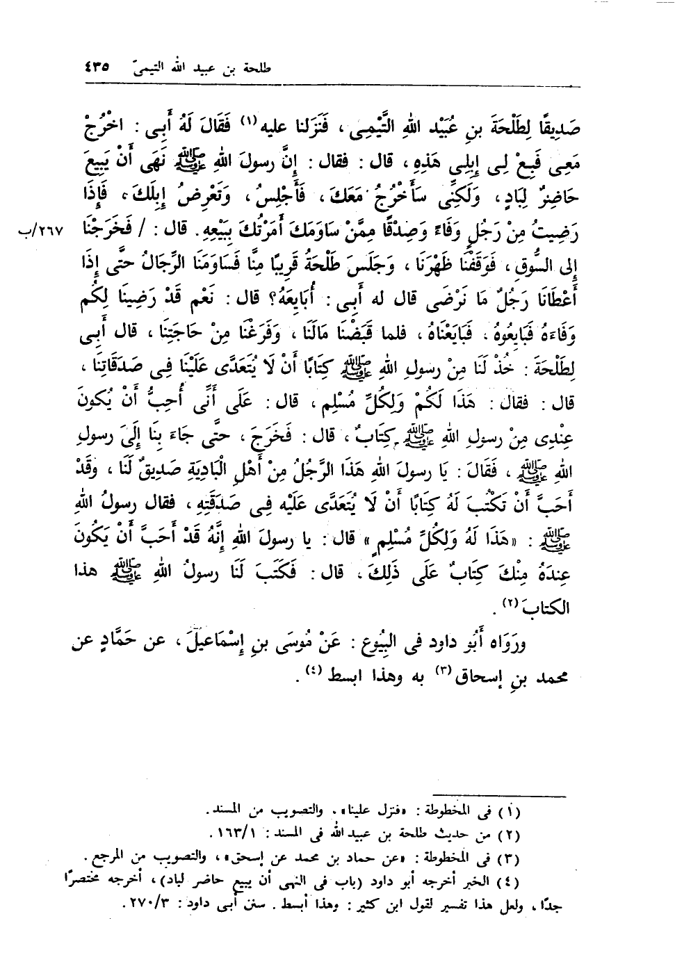 فقال له ابى: اخرج معى فبع لى إبلى هذه، قال: فقال: إن رسول الله - صلى الله عليه وسلم - نهى أن يبيع حاضرٌ لبادٍ، ولكنى سأخرج معك، فأجلس، وتعرض إبلك، فإذا رضيت من رجلٍ وفاءً وصدقًا ممن ساومك أمرتك ببيعه، قال: / فخرجنا إلى السوق، فوقفنا ظهرنا، وجلس طلحة قريبًا منا فساومنا الرجال حتى إذا أعطانا رجلٌ ما نرضى قال له أبى: أبايعه؟ قال: نعم قد رضينا لكم وفاءه فبايعوه، فبايعناه، فلما قبضنا مالنا، وفرغنا من حاجتنا، قال أبى لطلحة: خذ لنا من رسول الله - صلى الله عليه وسلم - كتابًا أن لا يتعدى علينا فى صدقاتنا، قال: فقال: هذا لكم ولكل مسلم، قال: على أنى أحب أن يكون عندى من رسول الله - صلى الله عليه وسلم - كتابٌ، قال: فخرج، حتى جاء بنا إلى رسول الله - صلى الله عليه وسلم -، فقال: يا رسول الله هذا الرجل من أهل البادءة صديق لنا، وقد أحب أن تكتب له كتابًا أن لا يتعدى عليه فى صدقته، فقال رسول الله - صلى الله عليه وسلم -: «هَذَا لَهُ وَلِكُلِّ مُسْلِمٍ» قال: يا رسول الله إنه قد أحب أن يكون عنده منك كتابًا على ذلك، قال: فكتب لنا رسول الله - صلى الله عليه وسلم - هذا الكتاب (¬2) .