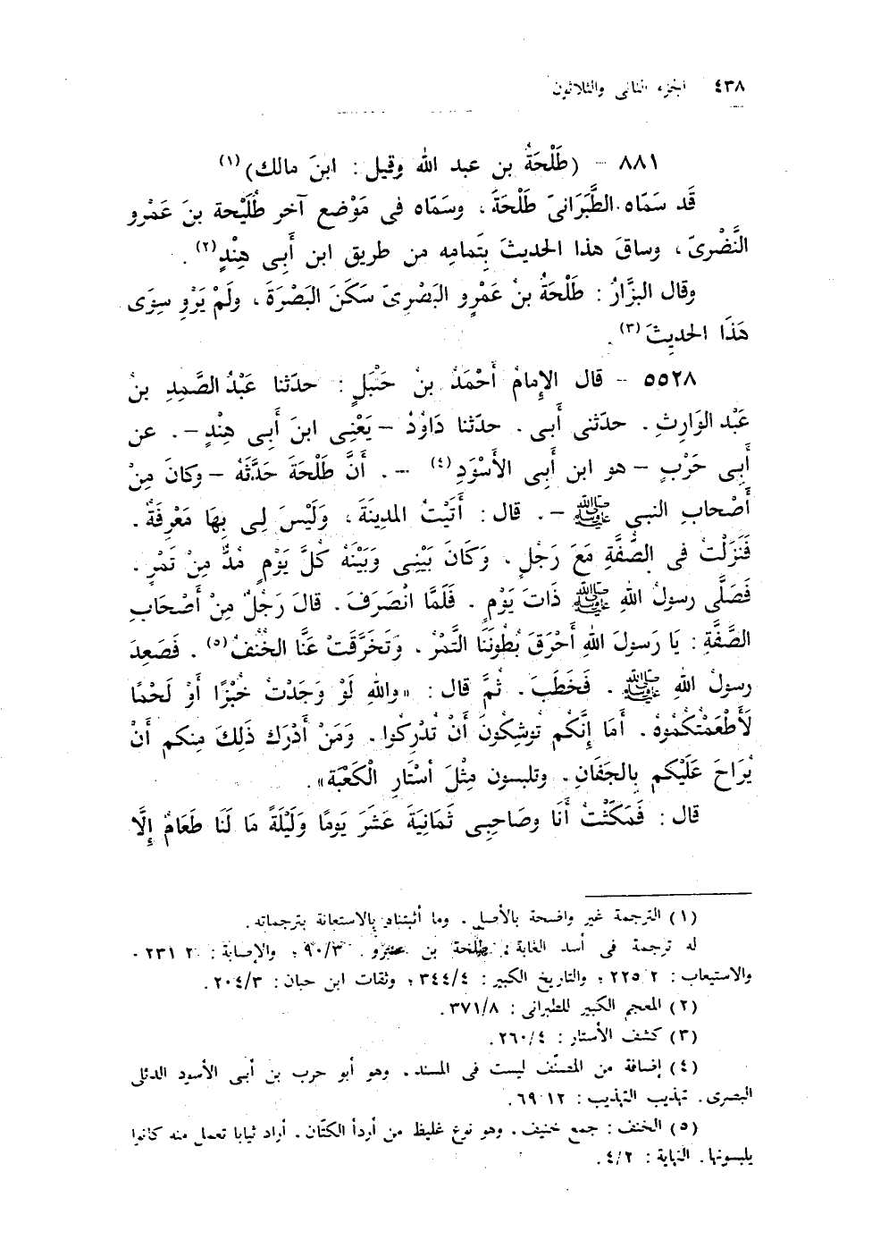 5528 - قال الإمام أحمد بن حنبل: حدثنا عبد الصمد بن عبد الوارث، حدثنى أبى، حدثنا داود- يعنى ابن أبى هند-، عن أبى حرب- هو ابن أبى الأسود (¬4) -. أن طلحة حدثه_ وكان من أصحاب النبى - صلى الله عليه وسلم -. قال: أّتَيْتُ المدِينَةَ، وَلَيْسَ لِى بِهَا مَعْرِفَةٌ، فَنَزَلْتُ فى الصُّفَّةِ مَعَ رَجُلٍ، وَكَانَ بَيْنِى وَبَيْنَهُ كُلَّ يَوْمٍ مُدٌ مِنْ تَمْرٍ، فصلى رسول الله - صلى الله عليه وسلم - ذات يومٍ، فلما انصرف، قال رجل من أصحاب الصفة: يا رسول الله أحرق بطوننا التمر، وتخرقت عنا الخُنُفُ (¬5) ، فصعد رسول الله - صلى الله عليه وسلم -، فخطب، ثم قال: «والله لَوْ وَجَدْتُ خُبْزًا أَوْ لَحْمًا لأطْعَمْتُكُمُوهُ، أَمَا إِنَّكُم تُوشِكُونَ أَنْ تُدْرِكُوا، وَمَنْ أَدْرَكَ ذَلكَ مِنكم أَنْ يُرَاحَ عَلَيكم بِالجَفَانِ، وتلبسون مَثْلَ أّسْتَارِ الْكَعْبَة» .