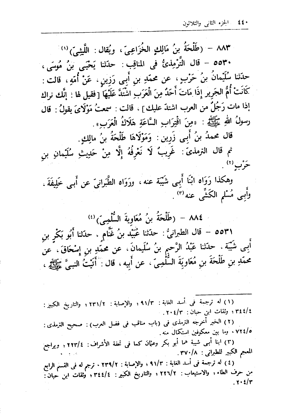 (¬4) له ترجمة فى أسد الغابة: 3/91؛ والإصابة: 2/239، ترجم له فى القسم الرابع من حرف الطاء؛ والاستيعاب: 2/226؛ والتاريخ الكبير: 4/344؛ وثقات ابن حبان: 3/204.