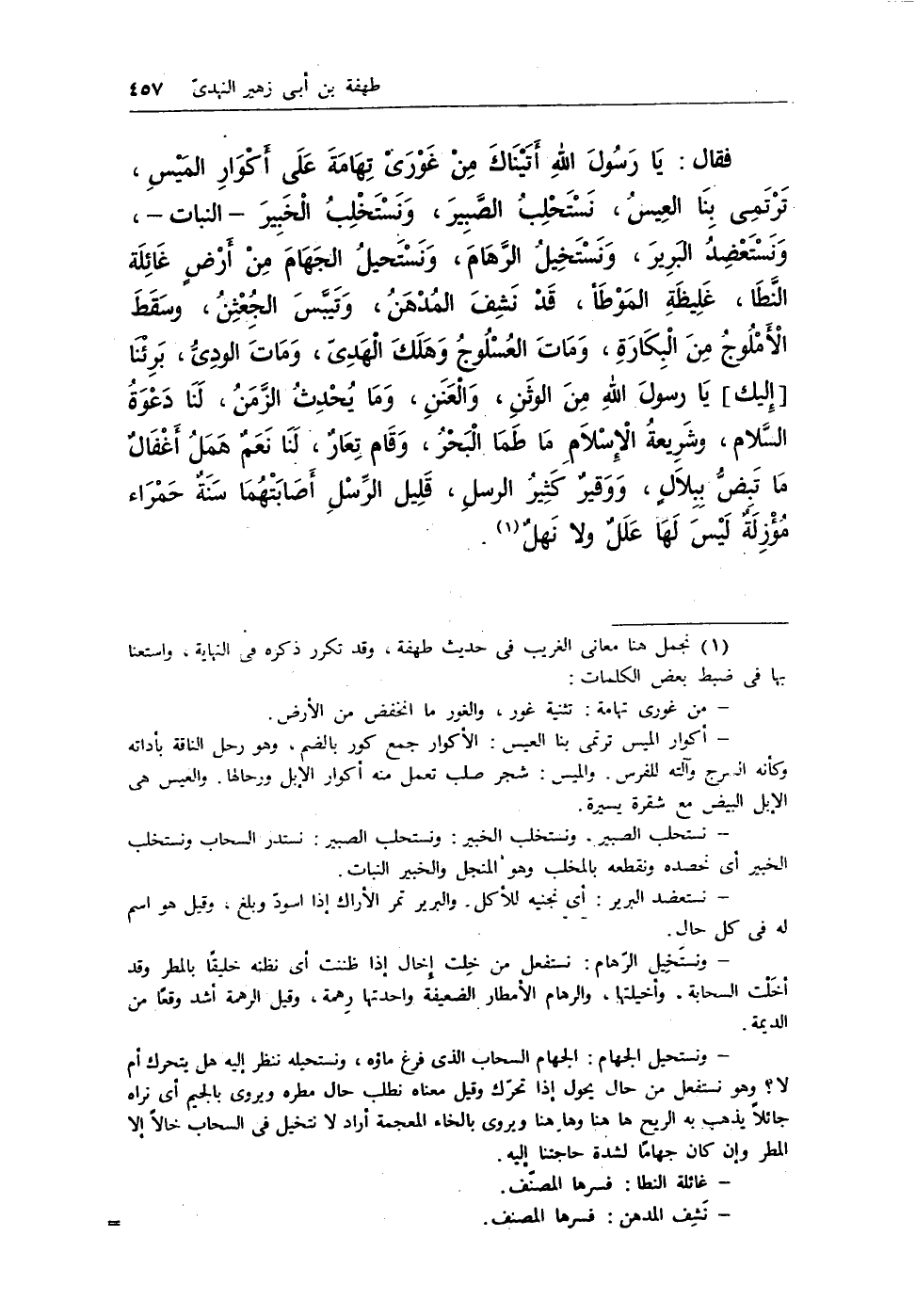 فقال يا رسول الله أتيناك من غَوْرَى تهامة على أكوار الميس، ترتمى بنا العيس، نستحلب الصبير، ونستجلب الخبير- النبات-، ونستعضد البرير، ونستخيل الرهام، ونستحيل الجهام من أرض غائلة النطا، غليظة الموطأ، قد نشف المدهن، وتيبس الجعثن، وسقط الأملوج من البكارة، ومات العسلوج وهلك الهدى، ومات الودى، برئنا [إليك] يا رسول الله من الوثن، والعنن، وما يحدث الزمن، لنا دعوة السلام، وشريعة الإسلام ما طما البحر، وقام تعار، لنا نعم همل أغفال ما تبض ببلال، ووقير كثير الرسل، قليل الرسل أصابتهما سنة حمراء موزلة ليس لها علل ولا نهل (¬1) .