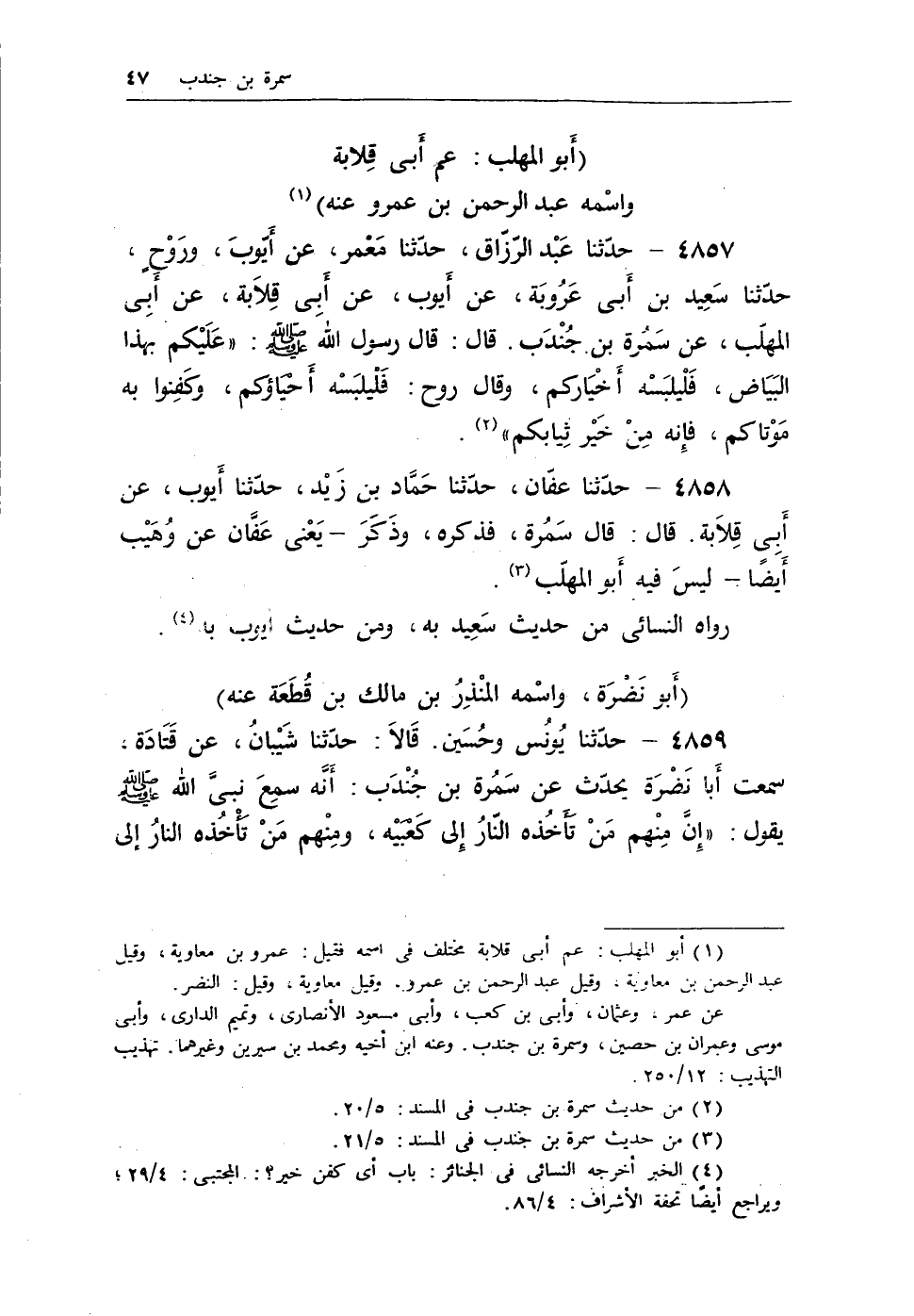 4858 - حدثنا عفان، حدثنا حماد بن زيد، حدثنا أيوب، عن أبى قلابة. قال: قال سمرة، فذكره، وذكر - يعنى عفان عن وهيب أيضا - ليس فيه أبو المهلب (¬2) .