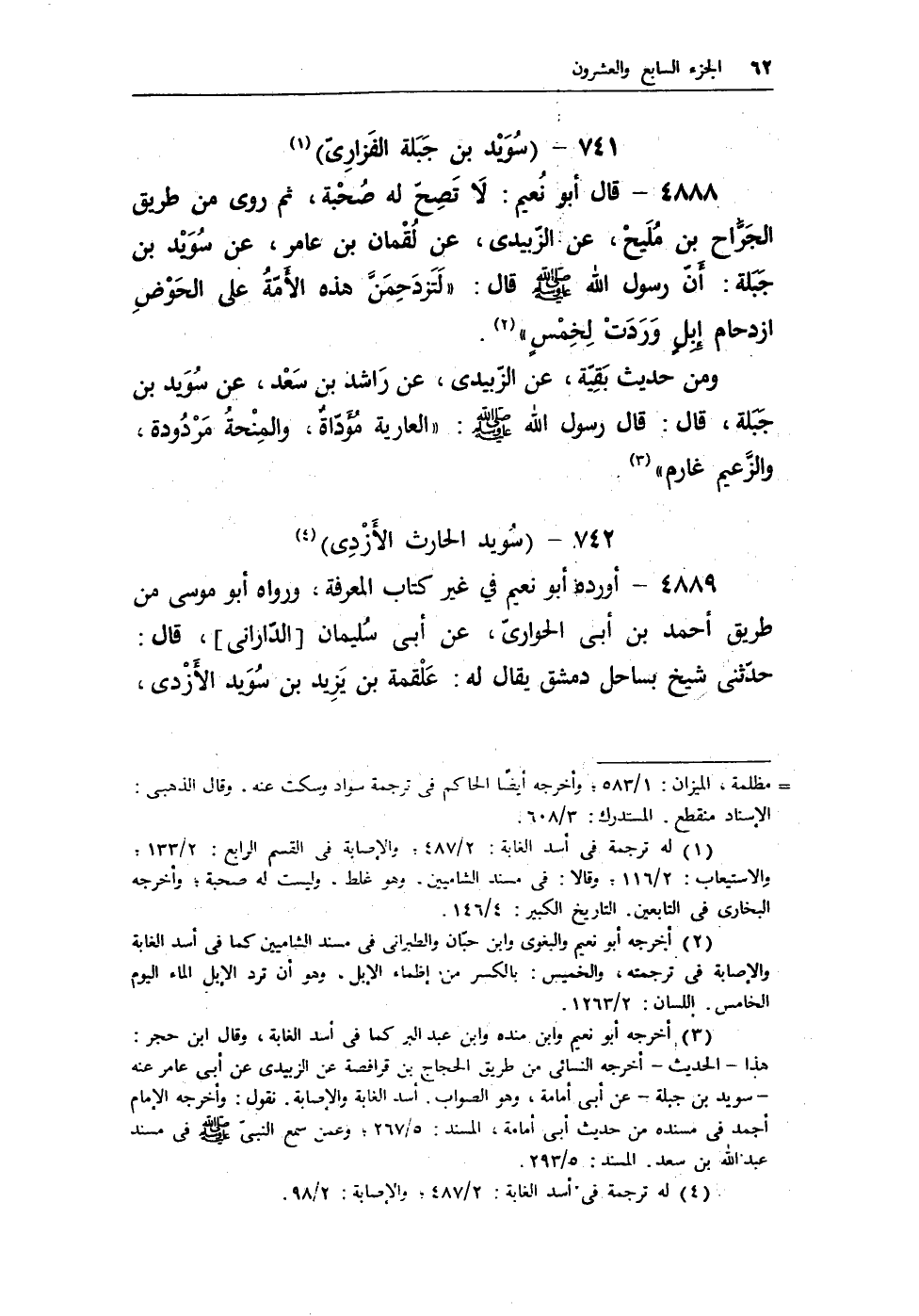 4888 - قال أبو نعيم: لا تصح له صحبة، ثم روى من طريق الجراح بن مليح، عن الزبيدى، عن لقمان بن عامر، عن سويد بن جبلة: بأن رسول الله - صلى الله عليه وسلم - قال: «لَتَزدَحِمَنَّ هذه الأمّةُ على الحَوْضِ ازدحام إبِلٍ وَرَدَتْ لِخْمسٍ» (¬2) .