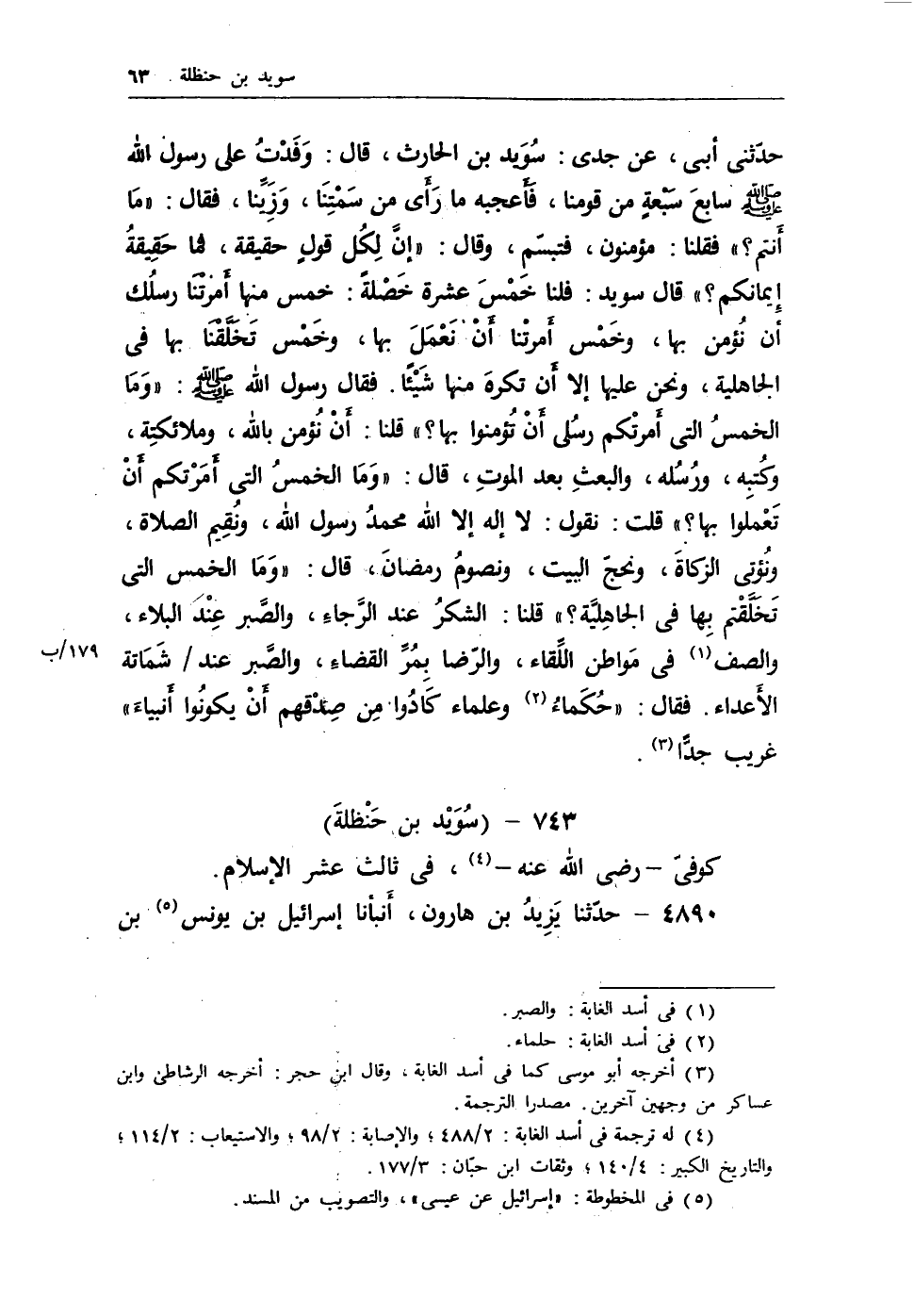 حدثنى أبى، عن جدى: سويد بن الحارث، قال: وفدت على رسول الله - صلى الله عليه وسلم - سابع سبعةٍ من قومنا، فأعجبه ما رأى من سمتنا، وزينا، فقال: «مَا أنْتُم؟» فقلنا: مؤمنون، فتبسم، وقال: «إنَّ لِكُل قولٍ حقيقة، فما حَقِيقةُ إيمَانكم؟» قال سويد: فلنا خمس عشرة خصلة: خمس منها أمرتنا رسلك أن نؤمن بها، وخمس أمرتنا أن نعمل بها، وخمس تخلقنا بها في الجاهلية، ونحن عليها إلا أن تكره منها شيئا. فقال رسول الله - صلى الله عليه وسلم -: «وَمَا الخَمْسُ التي أمرتْكم رُسلى أنْ تُؤمنوا بها؟» قلنا: أن نؤمن بالله، وملائكته، وكتبه، ورسله، والبعث بعد الموت، قال: «وما الخمْسُ التي أمَرْتكم أنْ تًعملوا بِها؟» قلت: نقول: لا إله إلا الله محمد رسول الله، ونقيم الصلاة، ونؤتى الذكاة، ونحج البيت، ونصوم رمضان، قال: «ومَا الخَمْس التى تَخَلَّقْتُم بها فِى الجَاهِليَّة؟» قلنا: الشكر عند الرَّجاء، والصبر عند البلاء، والصف (¬1) في مواطن اللقاء، والرضاء بمرِّ القضاء، والصبر عند / شماتة الأعداء. فقال: «حُكَماءُ (¬2) وعُلَمَاءُ كَادُوا مِنْ صِدْقِهم أنْ يَكُونُوا أنْبِيَاء» غريب جدًا (¬3) .