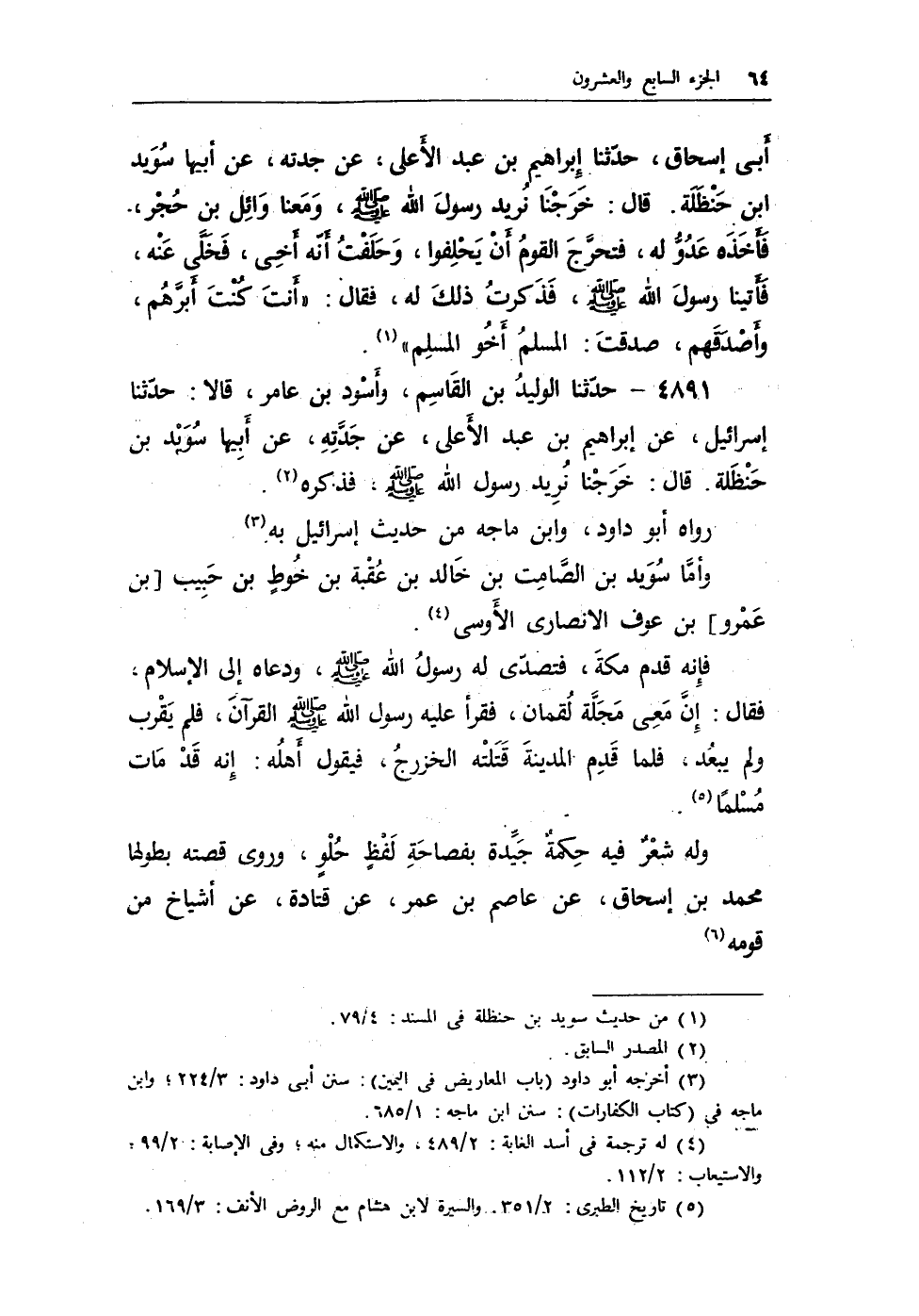 4891 - حدثنا الوليد بن القاسم، وأسود بن عامر، قالا: حدثنا إسرائيل، عن إبراهيم بن عبد الأعلى، عن جدته، عن أبيها سويد بن حنظلة. قال: خرجنا نريد رسول الله - صلى الله عليه وسلم -، فذكره (¬1) .