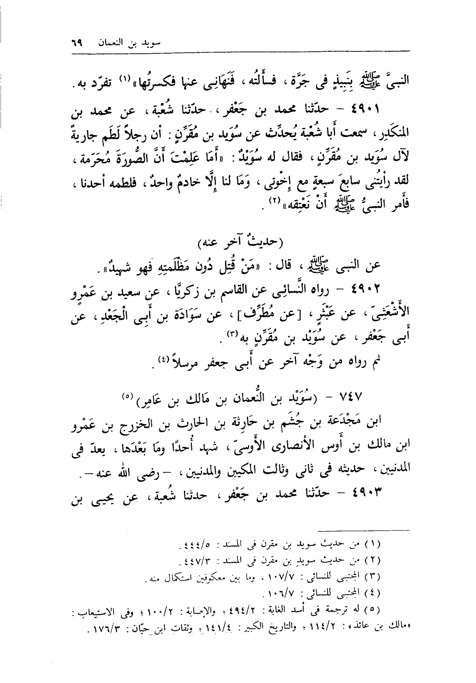 4902 - رواه النسائى عن القاسم بن زكريا، عن سعيد بن عمرو الأشعثىّ، عن عبثر، [عن مطرف] ، عن سوادة بن أبى الجعد، عن أبى جعفر، عن سويد بن مقرن به (¬2) .