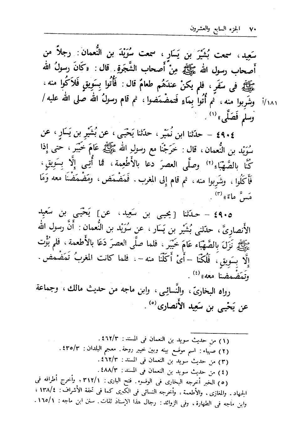 4905 - حدثنا [يحيى بن سعيد، عن] يحيى بن سعيد الأنصارى، حدثنا بشير بن يسار، عن سويد بن النعمان: أن رسول الله - صلى الله عليه وسلم - نزل بالصهباء عام خيبر، فلما صلى العصر دعا بالأطعمة، فلم يؤت إلا بسويق، فلكنا - أى أكلنا منه -، فلما كانت المغرب تمضمض وتمضمضنا معه» (¬3) .