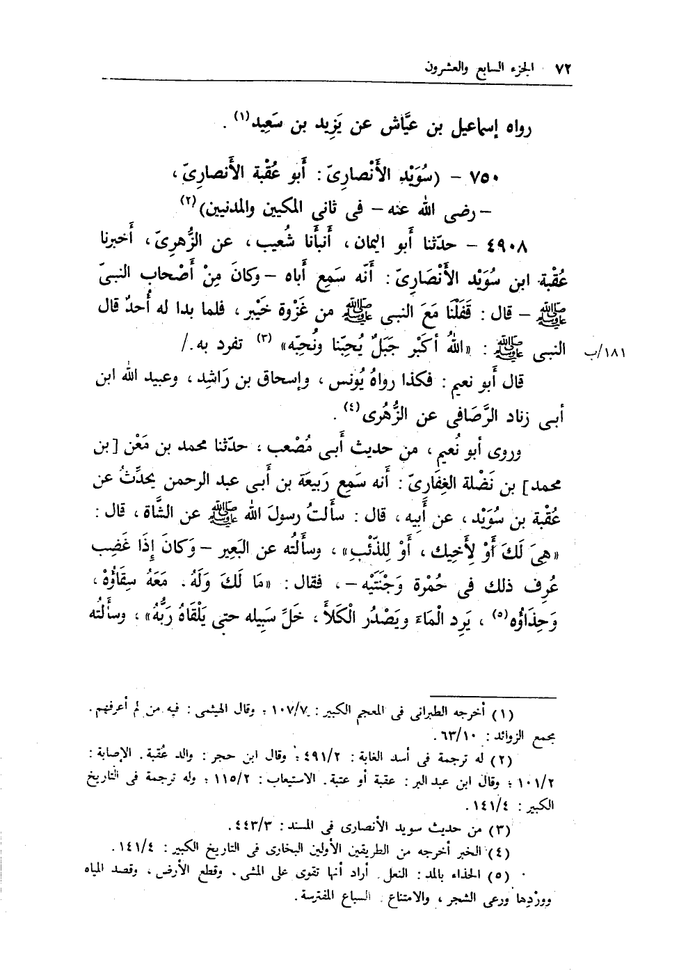 4908 - حدثنا أبو اليمان، أنبأنا شعيب، عن الزهرى، أخبرنا عقبة ابن سويد الأنصارى: أنه سمع أباه - وكان من أصحاب النبى - صلى الله عليه وسلم - قال: قفلنا مع النبى - صلى الله عليه وسلم - من غزوة خيبر، فلما بدا له أحدٌ قال النبى - صلى الله عليه وسلم -: «اللهُ أكبَر جَبَلٌ يُحِبّنا ونُحِبّه» (¬2) تفرد به. /