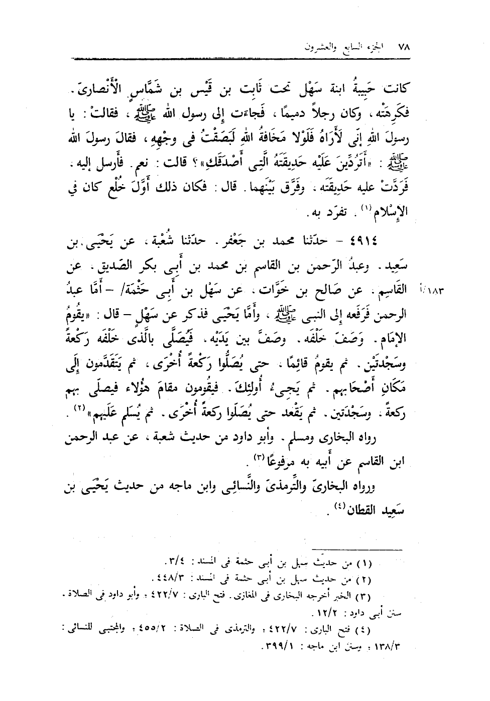 (¬3) فتح البارى: 7/ 422؛ والترمذى فى الصلاة: 2/ 455؛ والمجتبى للنسائى: 3/ 138؛ وسنن ابن ماجه: 1/ 399.
