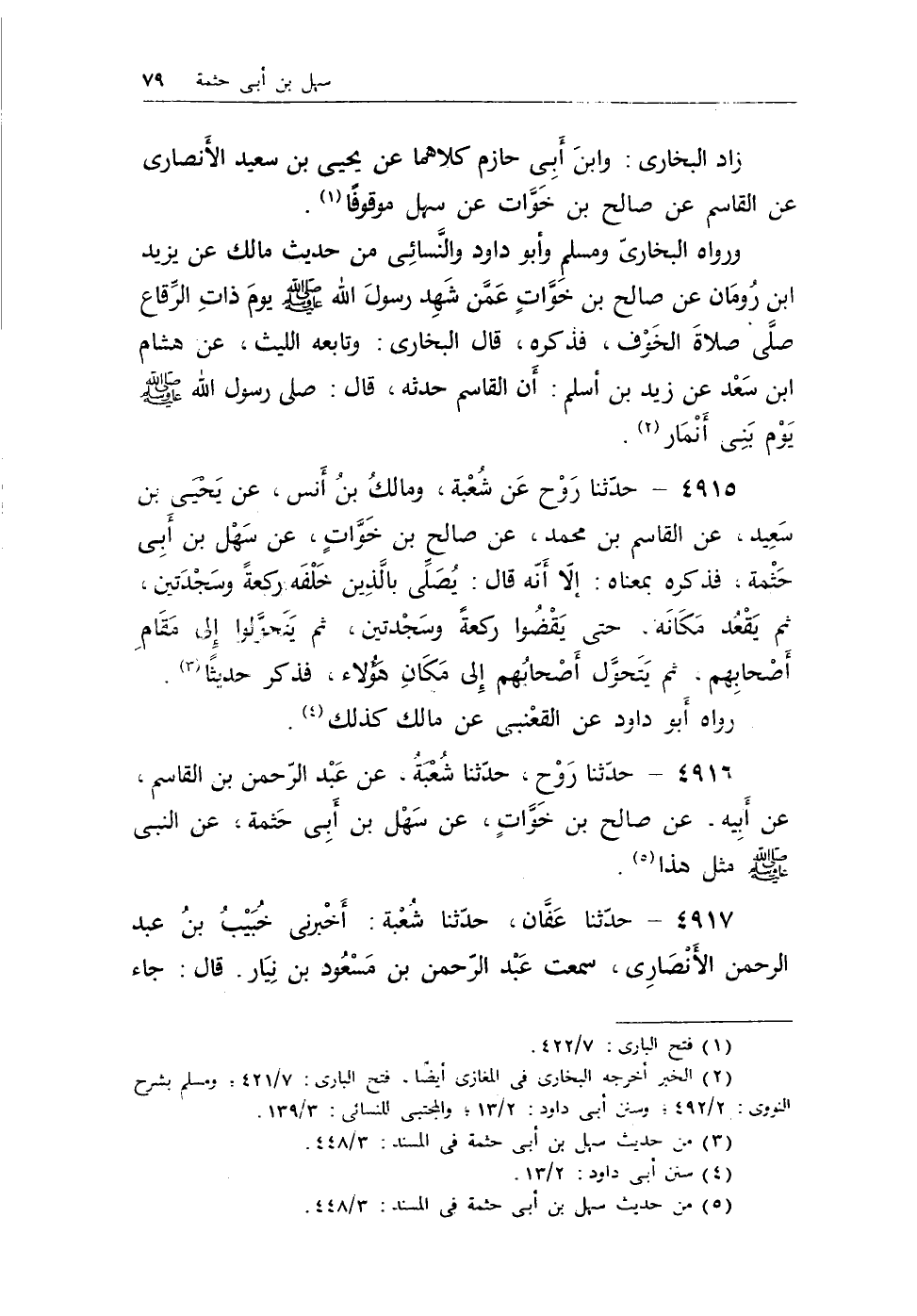 4916 - حدثنا روح، حدثنا شعبة، عن عبد الرحمن بن القاسم، عن ابيه، عن صالح بن خوات، عن سهل بن أبى حثمة، عن النبى - صلى الله عليه وسلم - مثل هذا (¬3) .