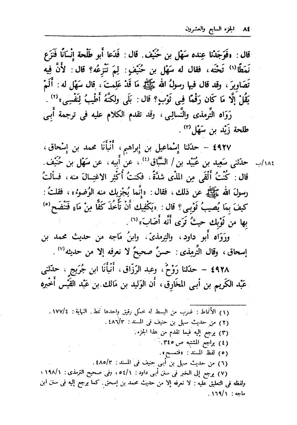 (¬4) يرجع إلى الخبر فى سنن أبى داود: 1/ 54؛ وفى صحيح الترمذى: 1/ 198؛ ولفظه في التعليق عليه: لا نعرفه إلا من حديث محمد بن إسحاق. كما يرجع إليه في سنن ابن ماجه: 1/ 169.