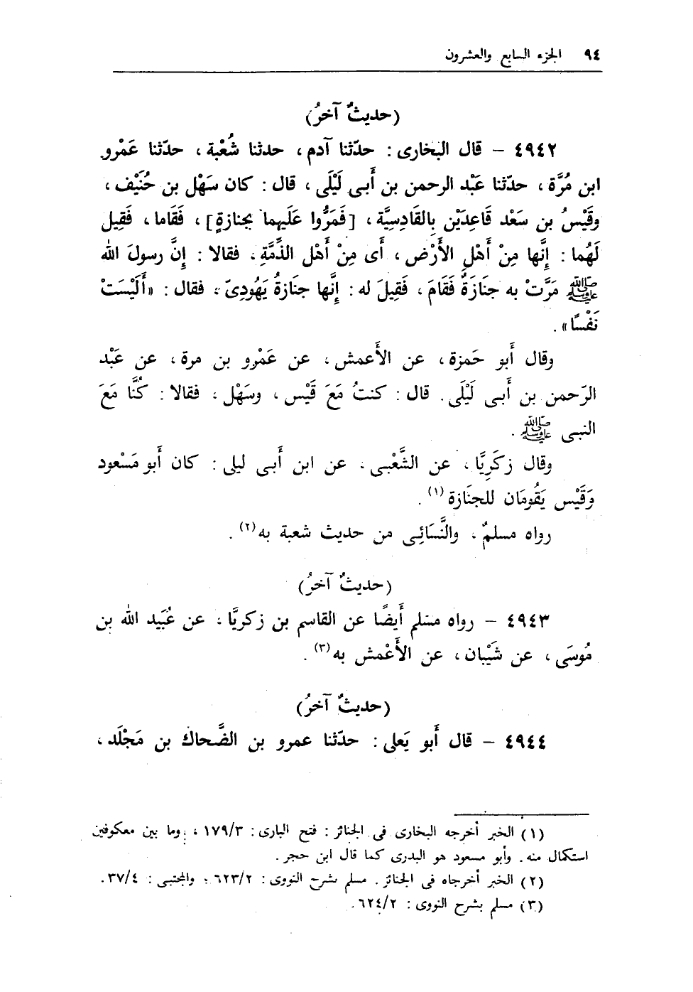 4942 - قال البخارى: حدثنا آدم، حدثنا شعبة، حدثنا عمرو بن مرة، حدثنا عبد الرحمن بن أبى ليلى، قال: كان سهل بن حنيف، وقيس بن سعد قاعدين بالقادسية، [فمروا عليهما بجنازة] ، فقاما، فقيل لهما: إنهما من أهل الأرض، أى من أهل الذمة، فقالا: إن رسول الله - صلى الله عليه وسلم - مرت به جنازة فقام، فقيل له: إنها جنازة يهودى، فقال: «أَليْسَتْ نَفْسًا»