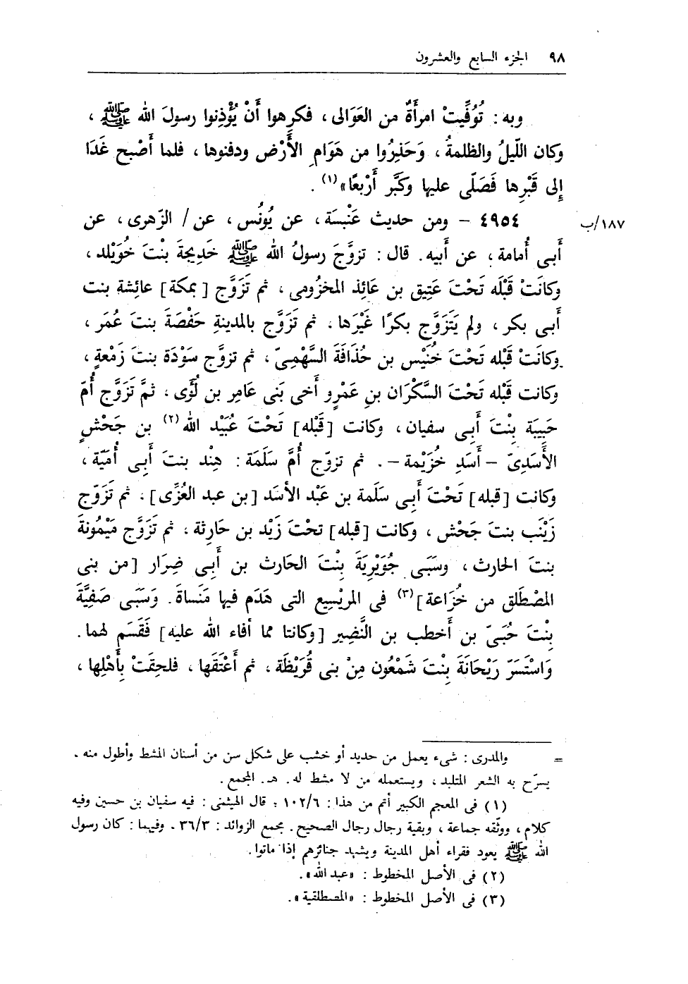 4954 - ومن حديث عنبسة، عن يونس، عن / الزهرى، عن أبى أمامة، عن أبيه. قال: تزوج رسول الله - صلى الله عليه وسلم - خديجة بنت خويلد، وكانت قبله تحت عتيق بن عائذ المخزومى، ثم تزوج [بمكة] عائشة بنت أبى بكر، ولم يتزوج بكرًا غيرها، ثم تزوج بالمدينة حفصة بنت عمر، وكانت قبله تحت خنيس بن حذافة السهمى، ثم تزوج سودة بنت زمعة، وكانت قبله تحت السكران بن عمرو أخى بنى عامر بن لؤى، ثم تزوج أم حبيبة بنت أبى سفيان وكانت [قبله] تحت عبيد الله (¬1) بن جحشٍ الأسدى - أسد خزيمة -، ثم تزوج أم سلمة: هند بنت أبى أمية، وكانت [قبله] تحت أبى سلمة بن عبد الأسد [بن عبد العزى] ، ثم تزوج زينب بنت جحش، وكانت [قبله] تحت زيد بن حارثة، ثم تزوج ميمونة بنت الحارث، وسبى جويرية بنت الحارث بن أبى ضرار [من بنى المصطلق من خزاعة] (¬2) في المريسيع التى هدم فيها منساة. وسبى صفية بنت حبى بن أخطب بن النضير [وكانتا مما أفاء الله عليه] فقسم لهما. واستسر ريحانة بنت شمعون من بنى قريظة، ثم أعتقها، فلحقت بأهلها
