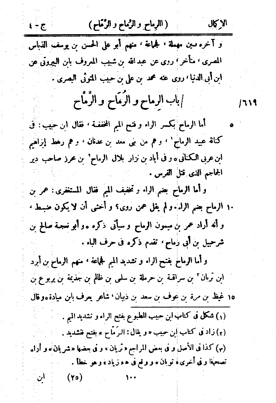أما الرماح بكسر الراء وفتح الميم المخففة، فقال ابن حبيب: في كنانة عبيد الرماح1، وهم من بني معد بن عدنان، وهم رهط إبراهيم بن عربي الكناني وفي أياد بن نزار بلال الرماح2 بن محرز صاحب دير الجماجم الذي قتل الفرس.