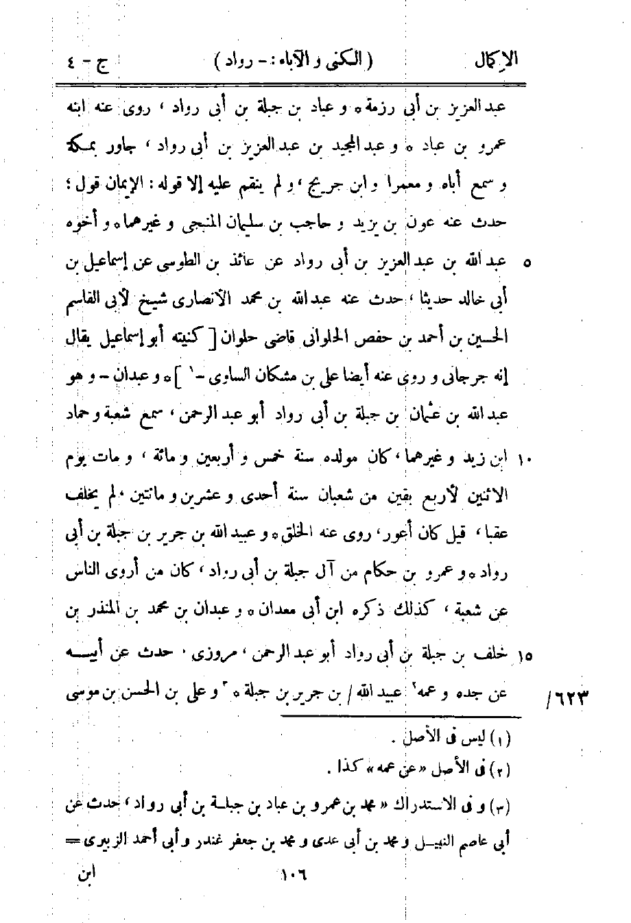 3 وفي الاستدراك "محمد بن عمرو بن عباد بن جبلة بن أبي رواد، حدث عن أبي عاصم النبيل ومحمد بن أبي عدي ومحمد بن جعفر غندر وأبي أحمد الزبيري وغيرهم، حدث عنه مسلم بن الحجاج في صحيحه وأبو داود السجستاني وعبد الله بن أحمد بن حنبل وغيرهم. وخلف بن عبد العزيز بن عثمان بن جبلة بن أبي داود، حدث عن أبيه، حدث عنه الحسن بن علي بن نصر الطوسي شيخ للطبراني".