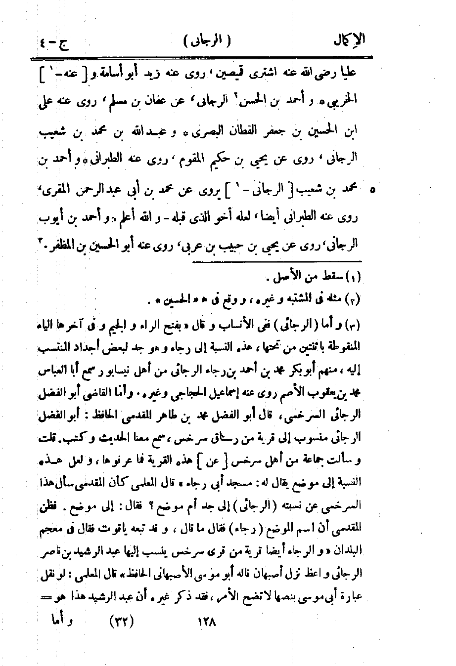 3 وأما "الرجائي" ففي الأنساب وقال "بفتح الراء والجيم وفي آخرها الياء المنقوطة باثنتين من تحتها، هذه النسبة إلى رجاء وهو جد لبعض أجداد المنتسب إليه، منهم أبو بكر محمد بن أحمد بن رجاء الرجائي من أهل نيسابور سمع أبا العباس محمد بن يعقوب الأصم روى عنه إسماعيل الحجاجي وغيره. وأما القاضي أبو الفضل الرجائي السرخسي، قال أبو الفضل محمد بن ظاهر المقدسي الحافظ: أبو الفضل الرجائي منسوب إلى قرية من رستاق سرخس، سمع معنا الحديث وكتب. قلت: وسألت جماعة من أهل سرخس [عن] هذه القرية فما عرفوها، ولعل هذه النسبة إلى موضع يقال له: مسجد أبي رجاء" قال المعلمي: كأن المقدسي سأل هذا السرخسي عن نسبته "الرجائي" إلى جد أم موضع؟ فقال: إلى موضع. فظن المقدسي أن اسم الموضع "رجاء" فقال ما قال، وقد تبعه ياقوت فقال في معجم البلدان "والرجاء أيضا قرية من قرى سرخس ينسب إليها عبد الرشيد بن ناصر الرجائي واعظ نزل أصبهان. قاله أبو موسى الأصبهاني الحافظ" قال المعلمي: لو نقل عبارة أبي موسى بنصها لاتضح الأمر، فقد ذكر غيره أن عبد الرشيد هذا هو =