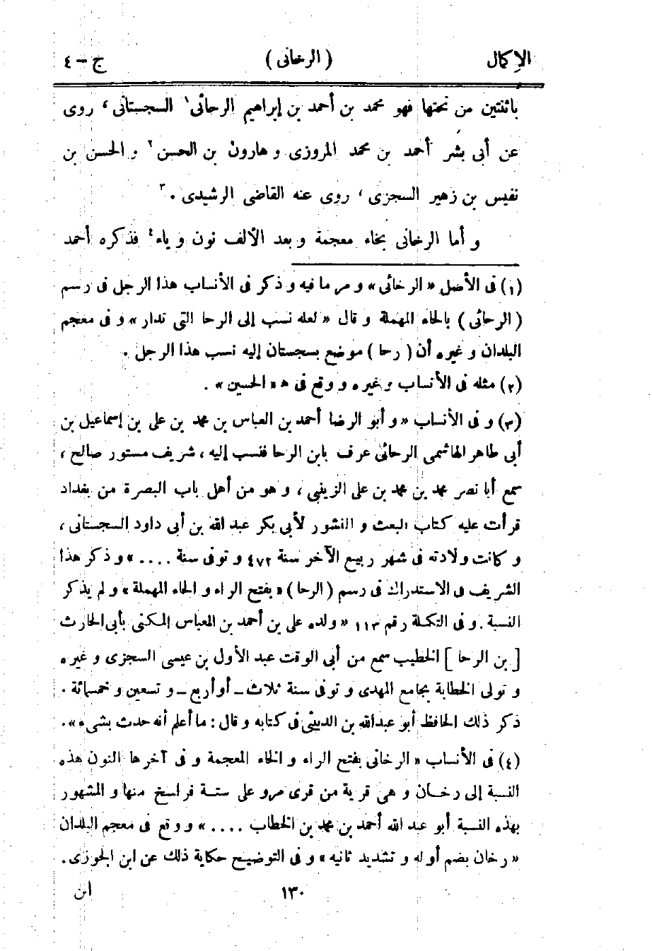 4 في الأنساب "الرخاني بفتح الراء والخاء المعجمة وفي آخرها النون هذه النسبة إلى رخان وهي قرية من قرى مرو على ستة فراسخ منها والمشهور بهذه النسبة: أبو عبد الله أحمد بن محمد بن الخطاب ... " ووقع في معجم البلدان "رخان بضم أوله وتشديد ثانيه" وفي التوضيح حكاية ذلك عن ابن الجوزي.