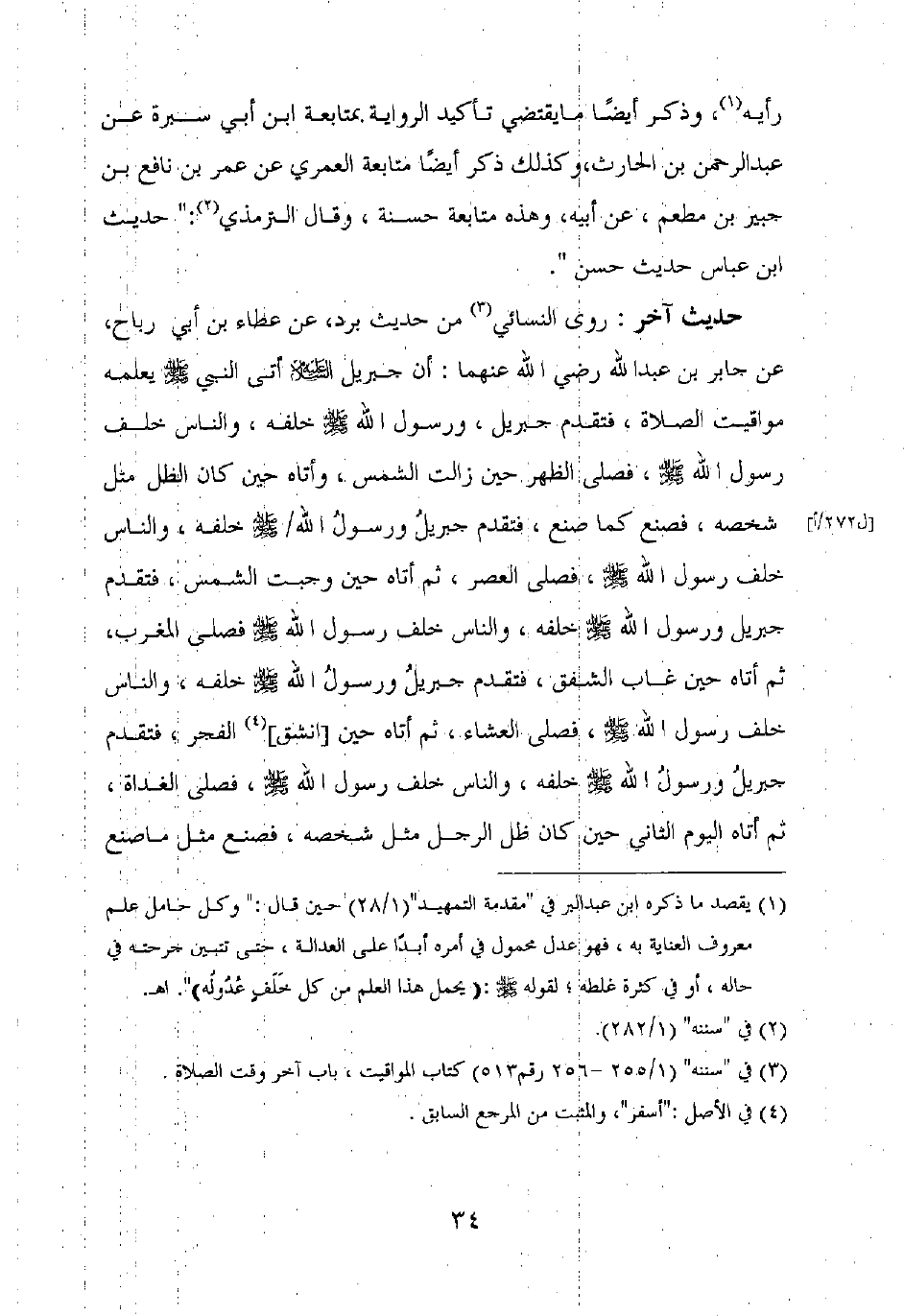 حديث آخر: روى النسائي من حديث برد، عن عطاء بن أبي رباح، عن جابر بن عبد الله رضي الله عنهما: أن جبريل عليه السلام أتى النبي صلى الله عليه وسلم يعلمه مواقيت الصلاة، فتقدم جبريل، ورسول الله صلى الله عليه وسلم خلفه، والناس خلف رسول الله صلى الله عليه وسلم، فصلى الظهر حين زالت الشمس، وأتاه حين كان الظل مثل شخصه، فصنع كما صنع، فتقدم جبريل ورسول الله صلى الله عليه وسلم خلفه، والناس خلف رسول الله صلى الله عليه وسلم، فصلى العصر، ثم أتاه حين وجبت الشمس، فتقدم جبريل ورسول الله صلى الله عليه وسلم خلفه، والناس خلف رسول الله صلى الله عليه وسلم فصلى المغرب، ثم أتاه حين غاب الشفق، فتقدم جبريل ورسول الله صلى الله عليه وسلم خلفه، والناس خلف رسول الله صلى الله عليه وسلم، فصلى العشاء، ثم أتاه حين [انشق] الفجر، فتقدم جبريل ورسول الله صلى الله عليه وسلم خلفه، والناس خلف رسول الله صلى الله عليه وسلم، فصلى الغداة، ثم أتاه اليوم الثاني حين كان ظل الرجل مثل شخصه، فصنع مثل ما صنع