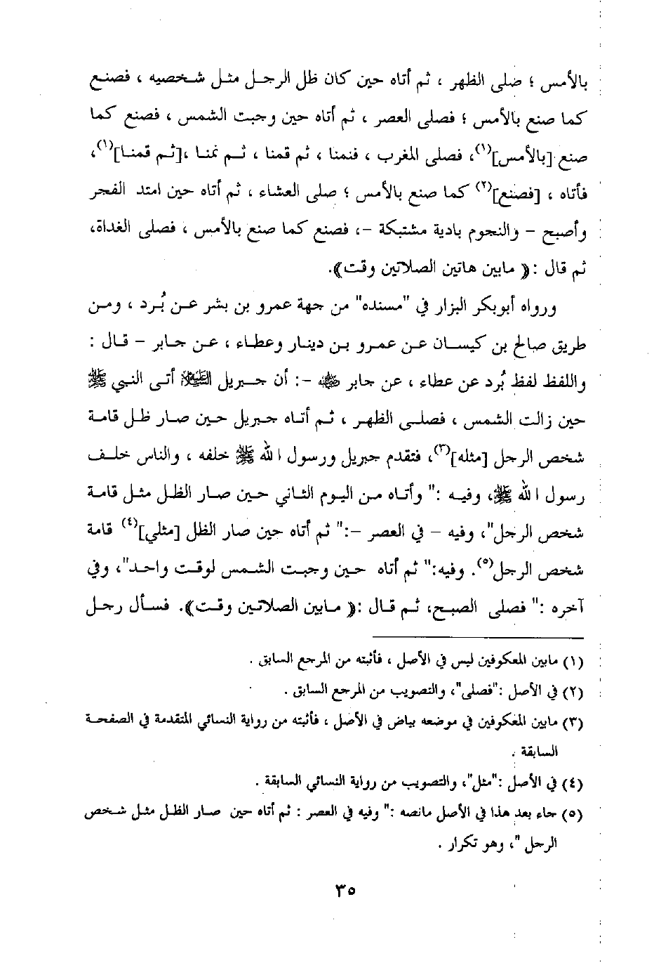 ورواه أبو بكر البزار في "مسنده" من جهة عمرو بن بشر عن برد، ومن طريق صالح بن كيسان عن عمرو بن دينار وعطاء، عن جابر – قال: واللفظ لفظ برد عن عطاء، عن جابر رضي الله عنه –: أن جبريل عليه السلام أتى النبي صلى الله عليه وسلم حين زالت الشمس، فصلى الظهر، ثم أتاه جبريل حين صار ظل قامة شخص الرجل [مثله]، فتقدم جبريل ورسول الله صلى الله عليه وسلم خلفه، والناس خلف رسول الله صلى الله عليه وسلم، وفيه: "وأتاه من اليوم الثاني حين صار الظل مثل قامة شخص الرجل"، وفيه – في العصر - "ثم أتاه حين صار الظل [مثلي] قامة شخص الرجل. وفيه: "ثم أتاه حين وجبت الشمس لوقت واحد"، وفي آخره: "فصلى الصبح، ثم قال: "ما بين الصلاتين وقت". فسأل رجل