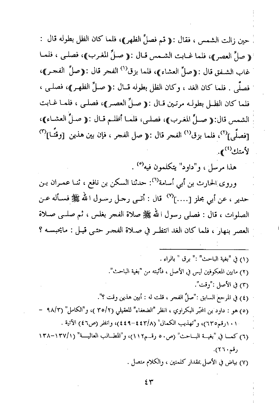 وروى الحارث بن أبي أسامة: حدثنا السكن بن نافع، ثنا عمران بن حدير، عن أبي مجلز [ ..... ] قال: أتى رجل رسول الله صلى الله عليه وسلم فسأله عن الصلوات، قال: فصلى رسول الله صلى الله عليه وسلم صلاة الفجر بغلس، ثم صلى صلاة العصر بنهار، فلما كان الغد انتظر في صلاة الفجر حتى قيل: ما يحبسه؟