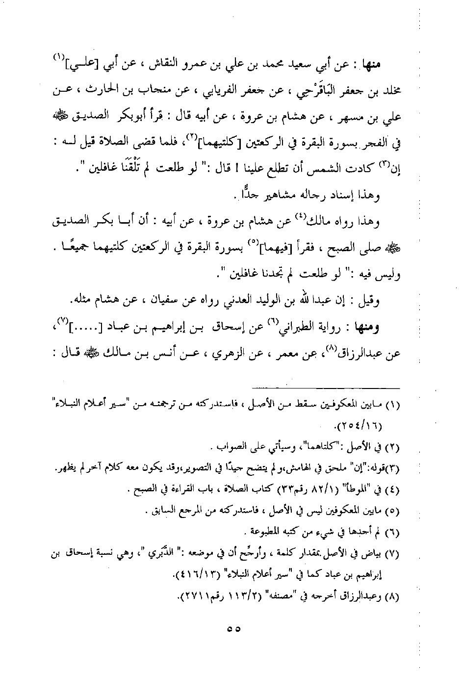 منها: عن أبي سعيد محمد بن علي بن عمرو النقاش، عن أبي [علي] مخلد بن جعفر الباقرحي، عن جعفر الفريابي، عن منجاب بن الحارث، عن علي بن مسهر، عن هشام بن عروة، عن أبيه قال: قرأ أبو بكر الصديق رضي الله عنه في الفجر بسورة البقرة في الركعتين [كلتيهما]، فلما قضى الصلاة قيل له: إن كادت الشمس أن تطلع علينا! قال: "لو طلعت لم تلقنا غافلين".