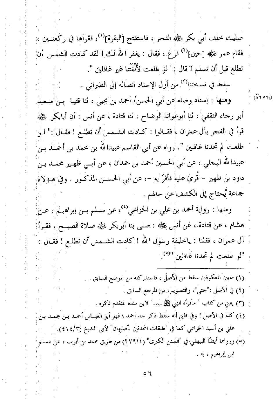 ومنها: رواية أحمد بن علي بن الخزاعي، عن مسلم بن إبراهيم، عن هشام، عن قتادة، عن أنس رضي الله عنه: صلى بنا أبو بكر رضي الله عنه صلاة الصبح، فقرأ آل عمران، فقلنا: يا خليفة رسول الله! كادت الشمس أن تطلع! فقال: "لو طلعت لم تجدنا غافلين".