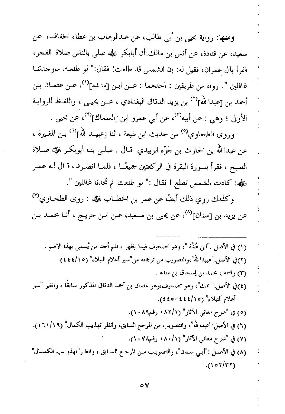 ومنها: رواية يحيى بن أبي طالب، عن عبد الوهاب بن عطاء الخفاف، عن سعيد، عن قتادة، عن أنس بن مالك: أن أبا بكر رضي الله عنه صلى بالناس صلاة الفجر، فقرأ بآل عمران، فقيل له: إن الشمس قد طلعت! فقال: "لو طلعت ما وجدتنا غافلين". رواه من طريقين: أحدهما: عن ابن [منده]، عن عثمان بن أحمد بن [عبد الله] بن يزيد الدقاق البغدادي، عن يحيى، واللفظ للرواية الأولى، وهي: عن أبيه، عن أبي عمرو ابن [السماك]، عن يحيى.
