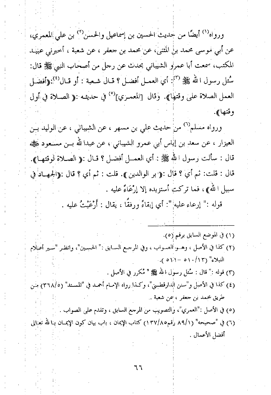 ورواه أيضا من حديث الحسين بن إسماعيل والحسن بن علي المعمري، عن أبي موسى محمد بن المثنى، عن محمد بن جعفر، عن شعبة، أخبرني عبيد المكتب، سمعت أبا عمرو الشيباني يحدث عن رجل من أصحاب النبي صلى الله عليه وسلم قال: سئل رسول الله صلى الله عليه وسلم: أي العمل أفضل؟ قال شعبة: أو قال: "أفضل العمل الصلاة على وقتها". وقال [المعمري] في حديثه: "الصلاة في أول وقتها".